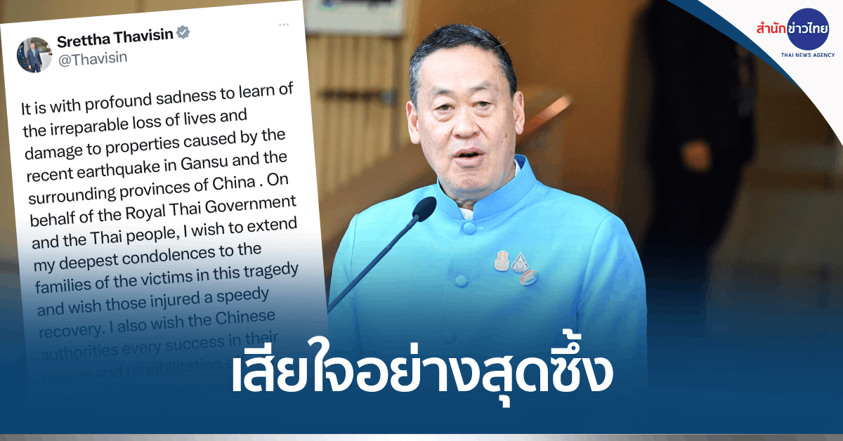 นายเศรษฐา ทวีสิน นายกรัฐมนตรี และรัฐมนตรีว่าการกระทรวงการคลัง โพสต์ข้อความ ถึงเหตุการณ์แผ่นดินไหวที่มณฑลกานซู ทางตะวันตกเฉียงเหนือของจีน ว่า ในนามของรัฐบาลไทยและประชาชนชาวไทย ขอแสดงความเสียใจอย่างสุดซึ้งต่อครอบครัวของผู้ได้รับผลกระทบจากเหตุแผ่นดินไหวในพื้นที่ทางตะวันตกเฉียงเหนือของจีนในครั้งนี้ พร้อมขอให้ผู้ได้รับบาดเจ็บฟื้นตัวโดยเร็ว และขอให้ทางการจีนประสบผลสำเร็จในการช่วยเหลือและฟื้นฟูอย่างรวดเร็ว ทั้งนี้ ประเทศไทยพร้อมให้การสนับสนุนเพื่อนชาวจีนของเราในยามยากลำบากนี้ .-สำนักข่าวไทย