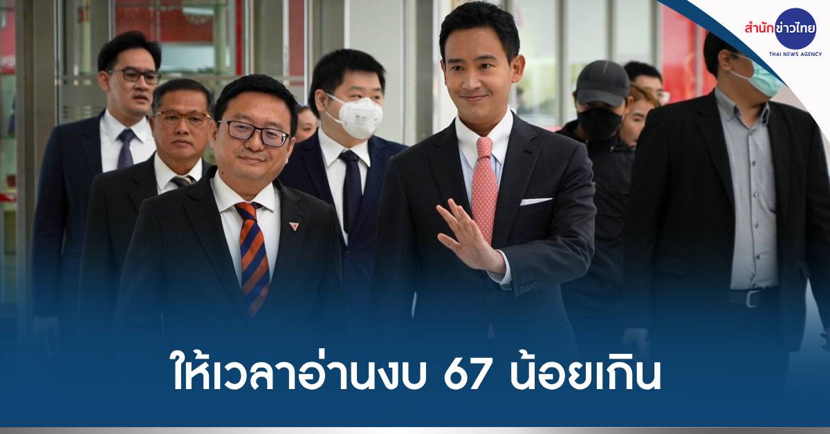 “แต่ต้องทำให้ดีที่สุด หวังว่ารัฐบาลน่าจะให้เวลากับสส.ทุกคน ไม่ใช่เฉพาะ สส. ฝั่งฝ่ายค้านอย่างเดียว สส.ทุกคนควรมีเวลาอ่าน เพราะพ.ร.บ.งบประมาณฉบับนี้ แม้จะยังไม่ได้เป็นฉบับของรัฐบาลใหม่ 100% แต่ถือว่าเป็นฉบับที่จะต้องจัดสรรงบประมาณใหม่เพื่อตอบสนองนโยบายเร่งด่วนของรัฐบาล ซึ่งเป็นเรื่องที่เราต้องตรวจสอบว่าการจัดสรรงบประมาณใหม่ตอบโจทย์สถานการณ์และเป้าหมายอย่างที่รัฐบาลบอกว่าจะเร่งดำเนินการหรือไม่” ผู้นำฝ่ายค้าน กล่าว.-314.-สำนักข่าวไทย