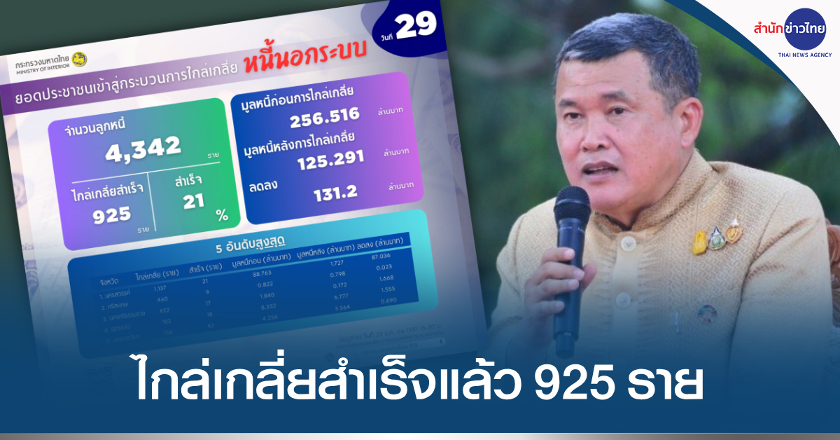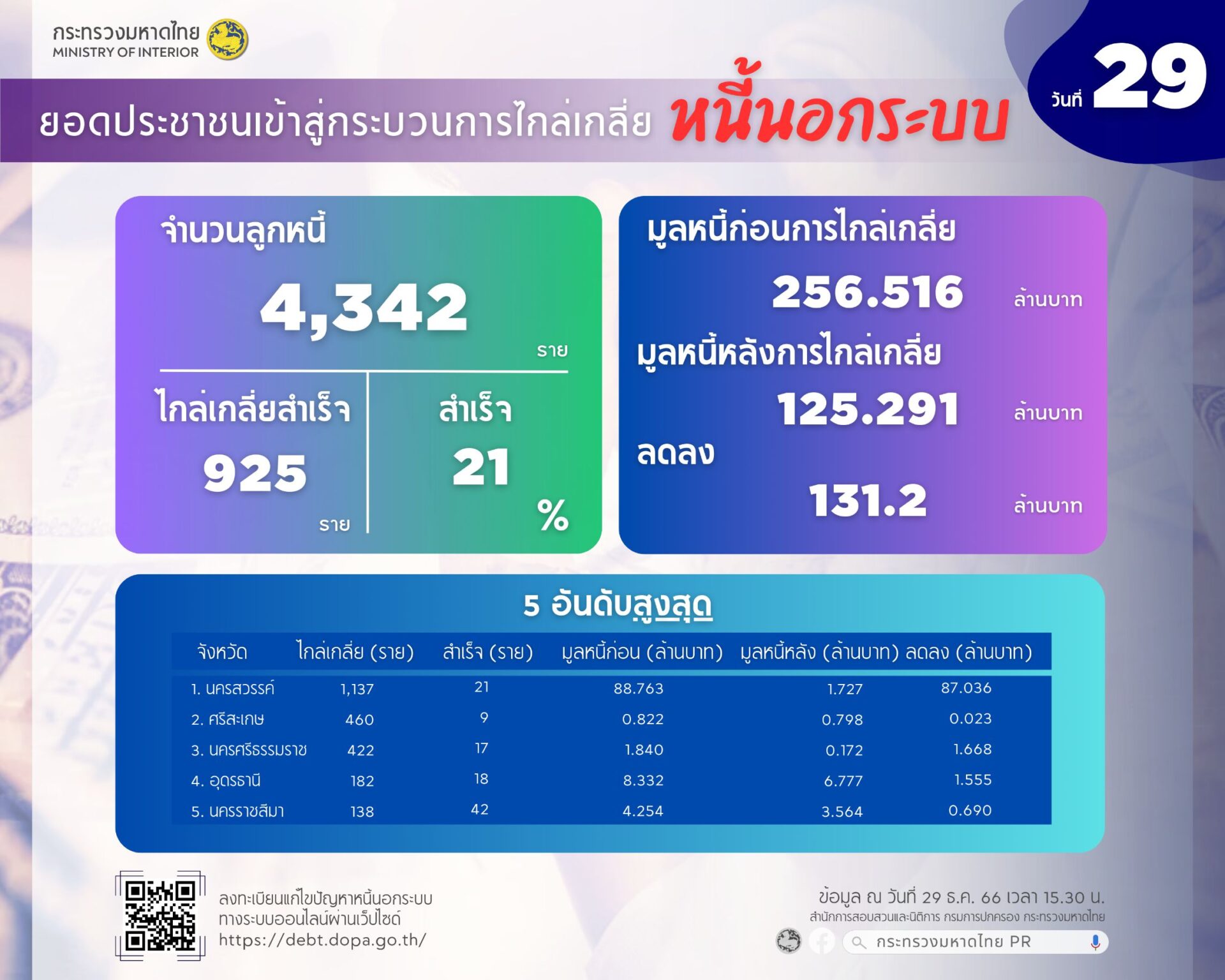 กรุงเทพฯ 29 ธ.ค. – มหาดไทย เผยผลการลงทะเบียนหนี้นอกระบบ 29 วัน ลงทะเบียนแล้ว 113,323 ราย มูลหนี้ 7,321 ล้านบาท ไกล่เกลี่ยสำเร็จแล้ว 925 ราย มูลหนี้ลดลงร่วม 131 ล้านบาท
