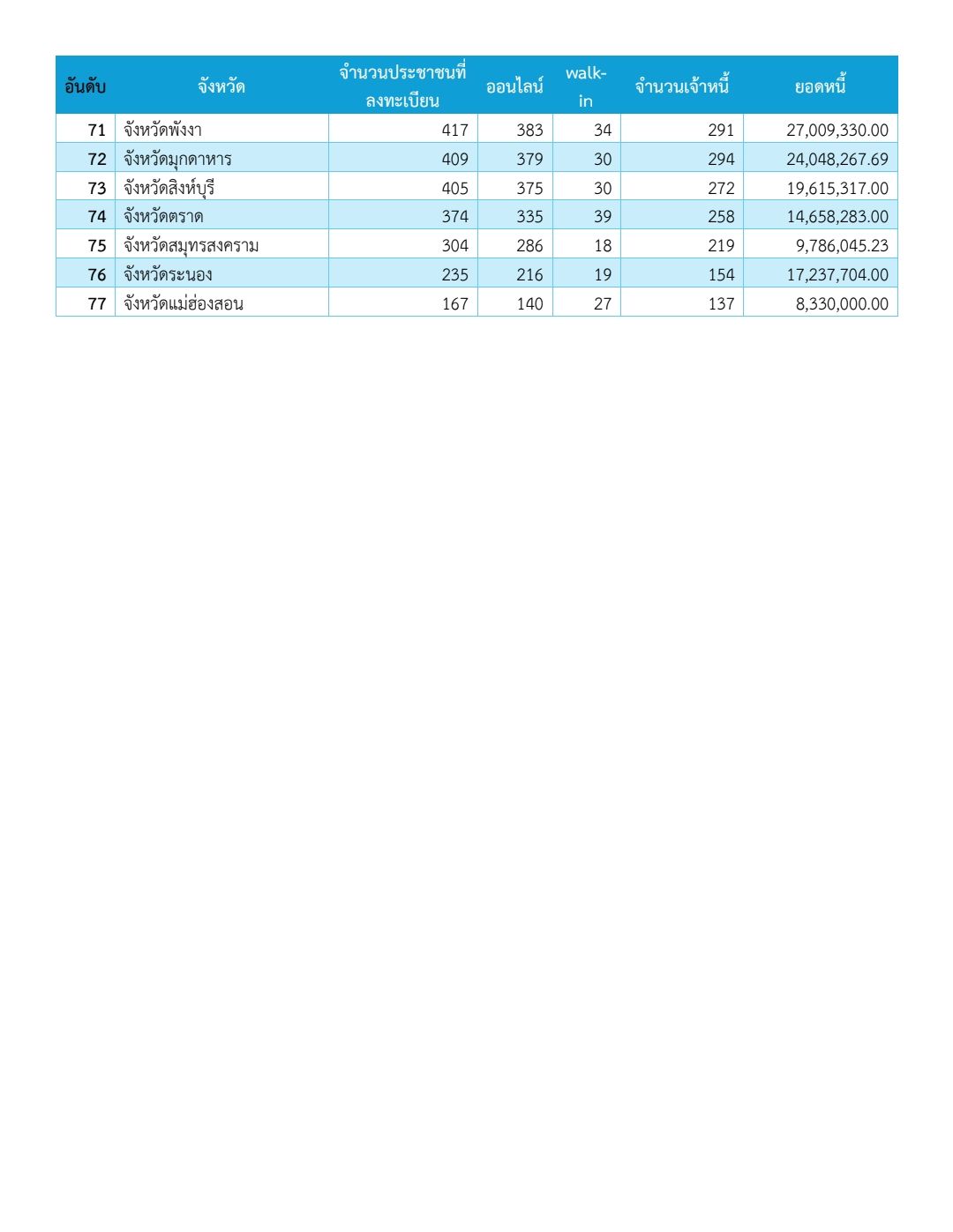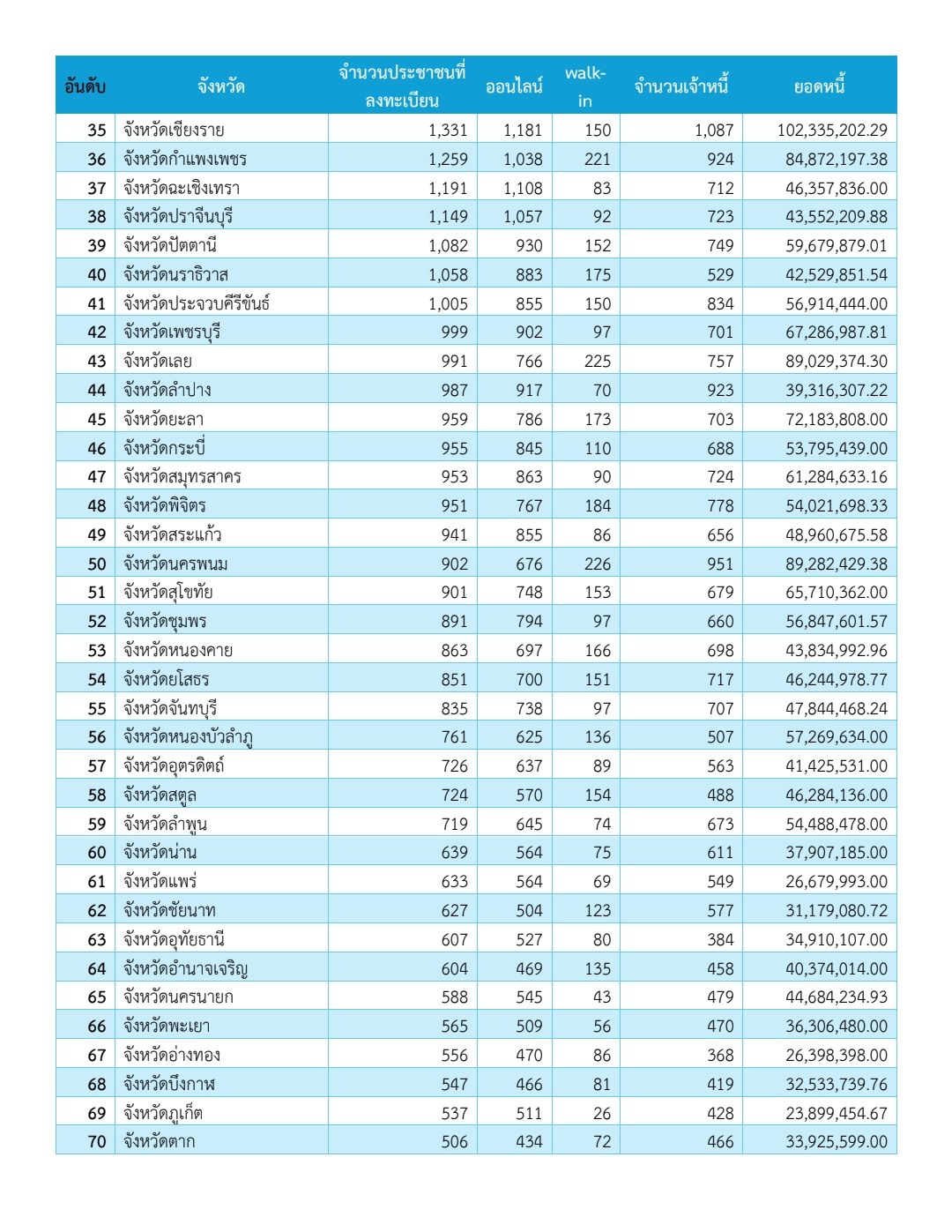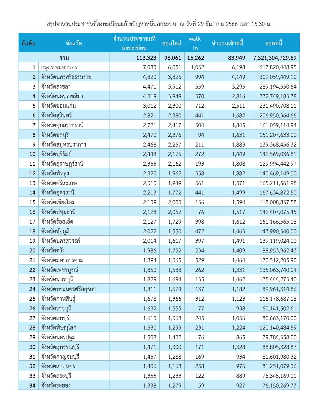 นายสุทธิพงษ์ จุลเจริญ ปลัดกระทรวงมหาดไทย เปิดเผยถึงการลงทะเบียนแก้ไขปัญหาหนี้นอกระบบ ซึ่งเป็นวันที่ 29 นับตั้งแต่เปิดลงทะเบียน โดยจากข้อมูลของสำนักการสอบสวนและนิติการ กรมการปกครอง เมื่อเวลา 15.30 น. มีมูลหนี้รวม 7,321.304 ล้านบาท ประชาชนลงทะเบียนแล้ว 113,323 ราย โดยเป็นการลงทะเบียนผ่านระบบออนไลน์ 98,061 ราย และการลงทะเบียน ณ ศูนย์อำนวยการแก้ไขหนี้นอกระบบ 15,262 ราย รวมจำนวนเจ้าหนี้ 83,949 ราย มีพื้นที่/จังหวัดที่มีผู้ลงทะเบียนมากที่สุด 5 ลำดับแรก 1. กรุงเทพมหานคร ยังคงมากที่สุด มีผู้ลงทะเบียน 7,083 ราย เจ้าหนี้ 6,198 ราย มูลหนี้ 617.820 ล้านบาท 2. จังหวัดนครศรีธรรมราช มีผู้ลงทะเบียน 4,820 ราย เจ้าหนี้ 4,149 ราย มูลหนี้ 309.059 ล้านบาท 3. จังหวัดสงขลา มีผู้ลงทะเบียน 4,471 ราย เจ้าหนี้ 3,295 ราย มูลหนี้ 289.194 ล้านบาท 4. จังหวัดนครราชสีมา มีผู้ลงทะเบียน 4,319 ราย เจ้าหนี้ 2,816 ราย มูลหนี้ 332.749 ล้านบาท 5. จังหวัดขอนแก่น มีผู้ลงทะเบียน 3,012 ราย เจ้าหนี้ 2,511 ราย มูลหนี้ 231.490 ล้านบาท ขณะที่จังหวัดที่มีผู้ลงทะเบียนน้อยที่สุด 5 ลำดับแรก ได้แก่ 1. จังหวัดแม่ฮ่องสอน มีผู้ลงทะเบียน 167 ราย เจ้าหนี้ 137 ราย มูลหนี้ 8.330 ล้านบาท 2. จังหวัดระนอง มีผู้ลงทะเบียน 235 ราย เจ้าหนี้ 154 ราย มูลหนี้ 17.237 ล้านบาท 3. จังหวัดสมุทรสงคราม มีผู้ลงทะเบียน 304 ราย เจ้าหนี้ 219 ราย มูลหนี้ 9.786 ล้านบาท 4. จังหวัดตราด มีผู้ลงทะเบียน 374 ราย เจ้าหนี้ 258 ราย มูลหนี้ 14.658 ล้านบาท และ 5. จังหวัดสิงห์บุรี มีผู้ลงทะเบียน 405 ราย เจ้าหนี้ 272 ราย มูลหนี้ 19.615 ล้านบาท