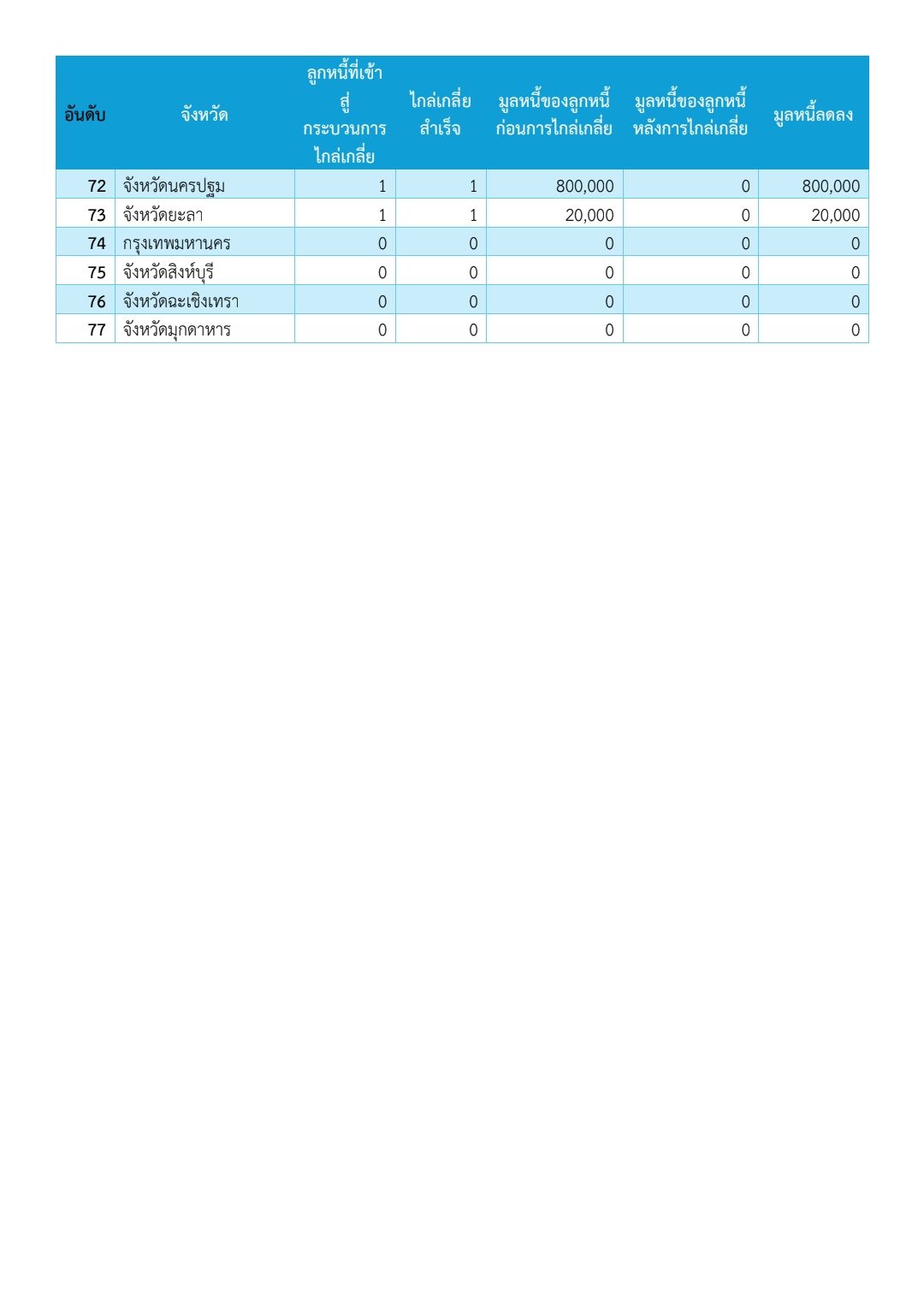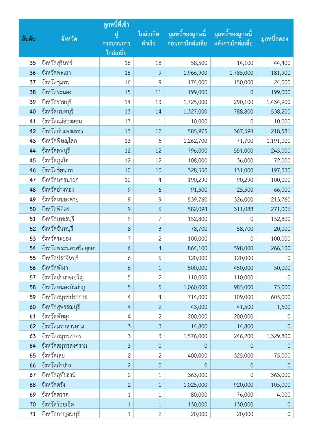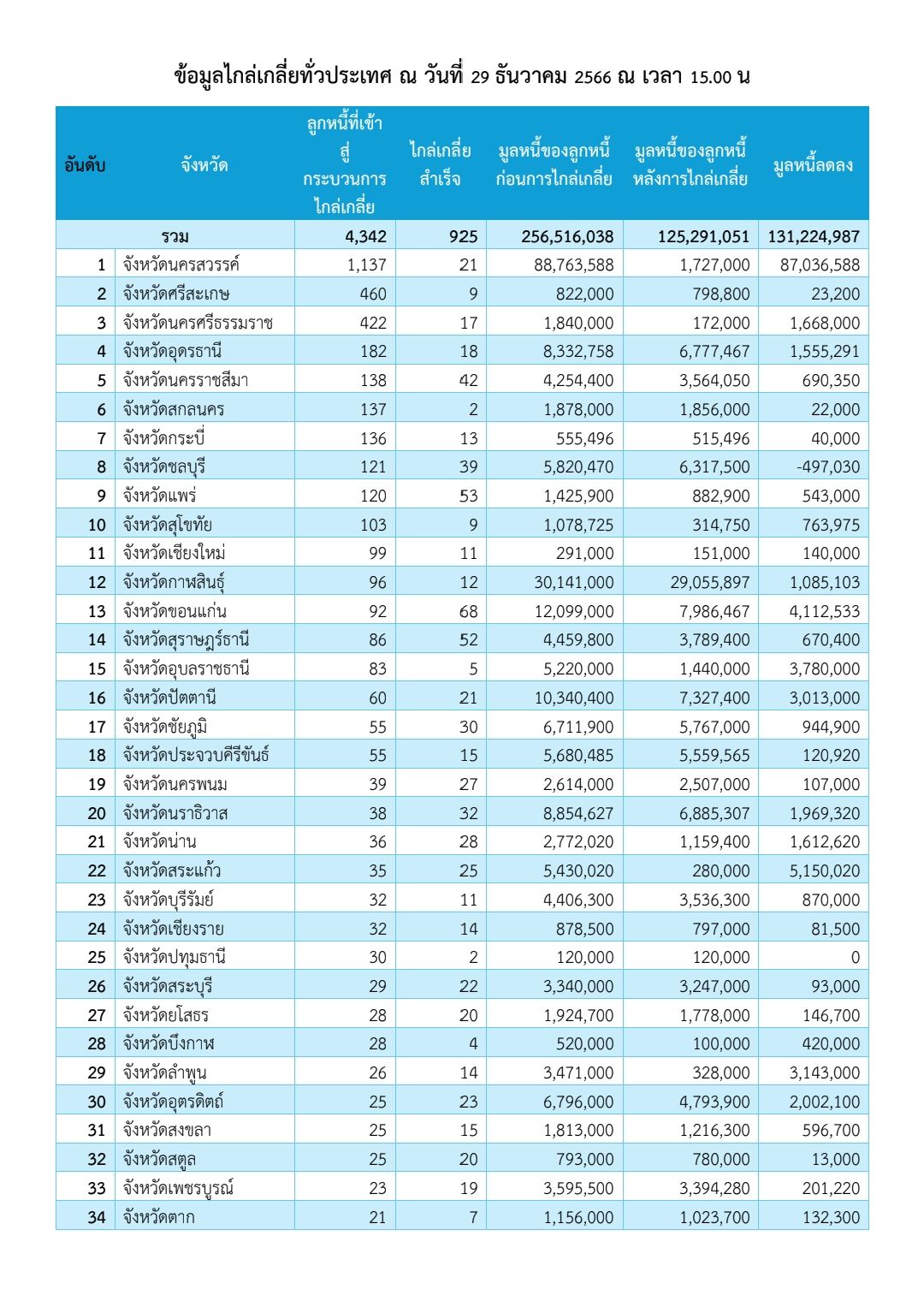 “สำหรับข้อมูลการไกล่เกลี่ยหนี้นอกระบบทั่วประเทศ พบว่ามีลูกหนี้เข้าสู่กระบวนการไกล่เกลี่ยแล้ว 4,342 ราย ไกล่เกลี่ยสำเร็จ 925 ราย มูลหนี้ของลูกหนี้ก่อนไกล่เกลี่ย 256.516 ล้านบาท หลังการไกล่เกลี่ย 125.291 ล้านบาท มูลหนี้ลดลง 131.224 ล้านบาท ซึ่งจังหวัดที่สามารถนำลูกหนี้เข้าสู่กระบวนการไกล่เกลี่ยได้มากที่สุดยังคงเป็นจังหวัดนครสวรรค์ โดยมีลูกหนี้ที่เข้าสู่กระบวนการไกล่เกลี่ย 1,137 ราย ไกล่เกลี่ยสำเร็จ 21 ราย มูลหนี้ของลูกหนี้ก่อนไกล่เกลี่ย 88.763 ล้านบาท หลังการไกล่เกลี่ย 1.727 ล้านบาท ทำให้มูลหนี้ของพี่น้องประชาชนในจังหวัด ลดลงมากถึง 87.036 ล้านบาท”