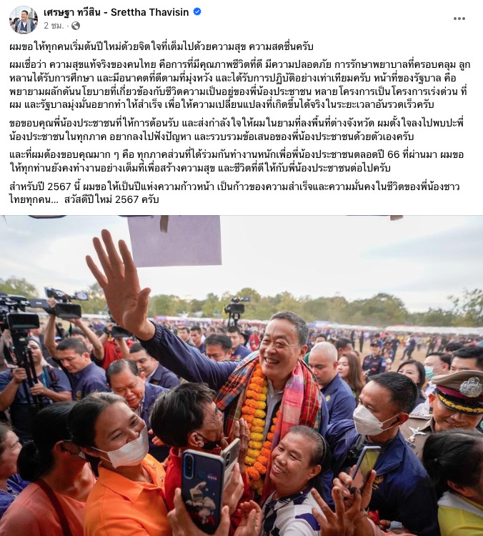 ผู้สื่อข่าวรายงานว่านายเศรษฐา ทวีสิน นายกรัฐมนตรี ได้โพสต์ข้อความในโอกาสปีใหม่ ความว่า ผมขอให้ทุกคนเริ่มต้นปีใหม่ด้วยจิตใจที่เต็มไปด้วยความสุข ความสดชื่นครับ