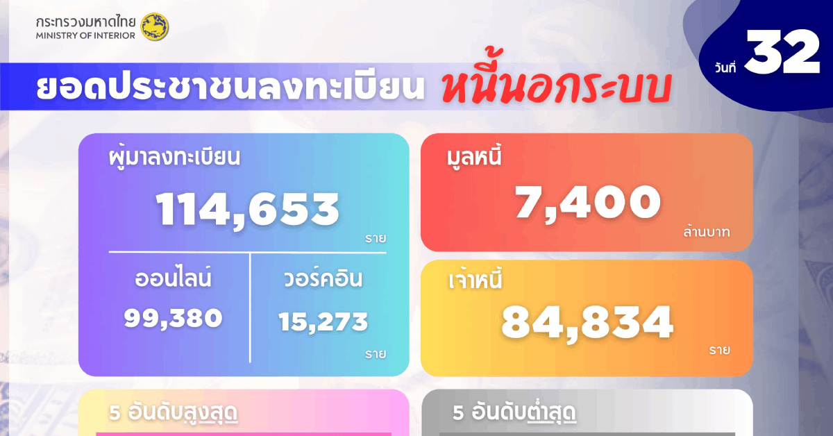นายสุทธิพงษ์ จุลเจริญ ปลัดกระทรวงมหาดไทย เปิดเผยถึงการลงทะเบียนแก้ไขปัญหาหนี้นอกระบบ ซึ่งเป็นวันแรกของปี พุทธศักราช 2567 เป็นวันที่ 32 นับตั้งแต่เปิดลงทะเบียน เมื่อวันที่ 1 ธันวาคม 2566 เป็นต้นมา โดยจากข้อมูลของสำนักการสอบสวนและนิติการ กรมการปกครอง เมื่อเวลา 15.30 น. มีมูลหนี้รวม 7,400.039 ล้านบาท ประชาชนลงทะเบียนแล้ว 114,653 ราย โดยเป็นการลงทะเบียนผ่านระบบออนไลน์ 99,380 ราย และการลงทะเบียน ณ ศูนย์อำนวยการแก้ไขหนี้นอกระบบ 15,273 ราย รวมจำนวนเจ้าหนี้ 84,834 ราย มีพื้นที่/จังหวัดที่มีผู้ลงทะเบียนมากที่สุด 5 ลำดับแรก 1. กรุงเทพมหานคร ยังคงมากที่สุด มีผู้ลงทะเบียน 7,162 ราย เจ้าหนี้ 6,252 ราย มูลหนี้ 624.107 ล้านบาท 2. จังหวัดนครศรีธรรมราช มีผู้ลงทะเบียน 4,873 ราย เจ้าหนี้ 4,199 ราย มูลหนี้ 314.288 ล้านบาท 3. จังหวัดสงขลา มีผู้ลงทะเบียน 4,507 ราย เจ้าหนี้ 3,320 ราย มูลหนี้ 290.784 ล้านบาท 4. จังหวัดนครราชสีมา มีผู้ลงทะเบียน 4,381 ราย เจ้าหนี้ 2,868 ราย มูลหนี้ 337.452 ล้านบาท 5. จังหวัดขอนแก่น มีผู้ลงทะเบียน 3,046 ราย เจ้าหนี้ 2,525 ราย มูลหนี้ 232.679 ล้านบาท ขณะที่จังหวัดที่มีผู้ลงทะเบียนน้อยที่สุด 5 ลำดับแรก ได้แก่ 1. จังหวัดแม่ฮ่องสอน มีผู้ลงทะเบียน 169 ราย เจ้าหนี้ 138 ราย มูลหนี้ 8.830 ล้านบาท 2. จังหวัดระนอง มีผู้ลงทะเบียน 236 ราย เจ้าหนี้ 161 ราย มูลหนี้ 17.594 ล้านบาท 3. จังหวัดสมุทรสงคราม มีผู้ลงทะเบียน 306 ราย เจ้าหนี้ 220 ราย มูลหนี้ 9.886 ล้านบาท 4. จังหวัดตราด มีผู้ลงทะเบียน 379 ราย เจ้าหนี้ 261 ราย มูลหนี้ 15.068 ล้านบาท และ 5. จังหวัดสิงห์บุรี มีผู้ลงทะเบียน 410 ราย เจ้าหนี้ 274 ราย มูลหนี้ 19.645 ล้านบาท