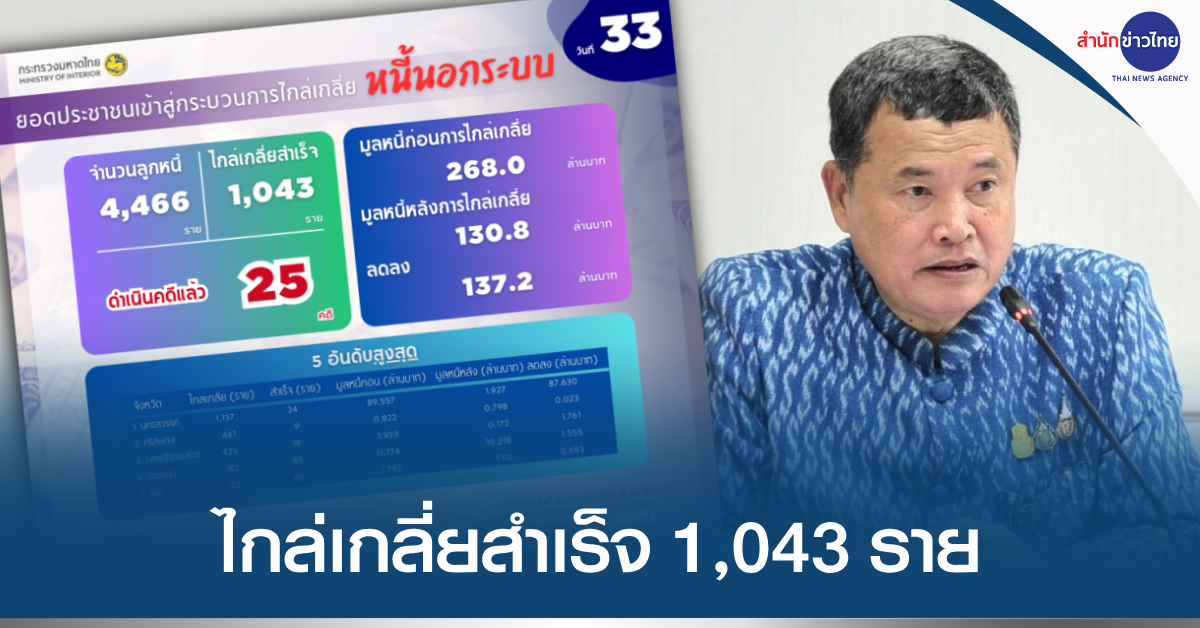 นายสุทธิพงษ์ จุลเจริญ ปลัดกระทรวงมหาดไทย เปิดเผยถึงการลงทะเบียนแก้ไขปัญหาหนี้นอกระบบ เป็นวันที่ 33 หรือเข้าสู่เดือนที่ 2 นับตั้งแต่เปิดลงทะเบียน เมื่อวันที่ 1 ธันวาคม 2566 เป็นต้นมา โดยจากข้อมูลของสำนักการสอบสวนและนิติการ กรมการปกครอง เมื่อเวลา 15.30 น. มีมูลหนี้รวม 7,515.719 ล้านบาท ประชาชนลงทะเบียนแล้ว 115,542 ราย โดยเป็นการลงทะเบียนผ่านระบบออนไลน์ 100,041 ราย และการลงทะเบียน ณ ศูนย์อำนวยการแก้ไขหนี้นอกระบบ 15,501 ราย รวมจำนวนเจ้าหนี้ 85,666 ราย มีพื้นที่/จังหวัดที่มีผู้ลงทะเบียนมากที่สุด 5 ลำดับแรก 1. กรุงเทพมหานคร ยังคงมากที่สุด มีผู้ลงทะเบียน 7,212 ราย เจ้าหนี้ 6,310 ราย มูลหนี้ 677.607 ล้านบาท 2. จังหวัดนครศรีธรรมราช มีผู้ลงทะเบียน 4,900 ราย เจ้าหนี้ 4,222 ราย มูลหนี้ 318.981 ล้านบาท 3. จังหวัดสงขลา มีผู้ลงทะเบียน 4,530 ราย เจ้าหนี้ 3,341 ราย มูลหนี้ 292.269 ล้านบาท 4. จังหวัดนครราชสีมา มีผู้ลงทะเบียน 4,416 ราย เจ้าหนี้ 2,887 ราย มูลหนี้ 339.335 ล้านบาท 5. จังหวัดขอนแก่น มีผู้ลงทะเบียน 3,064 ราย เจ้าหนี้ 2,540 ราย มูลหนี้ 233.929 ล้านบาท ขณะที่จังหวัดที่มีผู้ลงทะเบียนน้อยที่สุด 5 ลำดับแรก ได้แก่ 1. จังหวัดแม่ฮ่องสอน มีผู้ลงทะเบียน 172 ราย เจ้าหนี้ 139 ราย มูลหนี้ 8.910 ล้านบาท 2. จังหวัดระนอง มีผู้ลงทะเบียน 237 ราย เจ้าหนี้ 162 ราย มูลหนี้ 17.614 ล้านบาท 3. จังหวัดสมุทรสงคราม มีผู้ลงทะเบียน 307 ราย เจ้าหนี้ 222 ราย มูลหนี้ 9.976 ล้านบาท 4. จังหวัดตราด มีผู้ลงทะเบียน 383 ราย เจ้าหนี้ 265 ราย มูลหนี้ 15.142 ล้านบาท และ 5. จังหวัดสิงห์บุรี มีผู้ลงทะเบียน 415 ราย เจ้าหนี้ 277 ราย มูลหนี้ 19.955 ล้านบาท