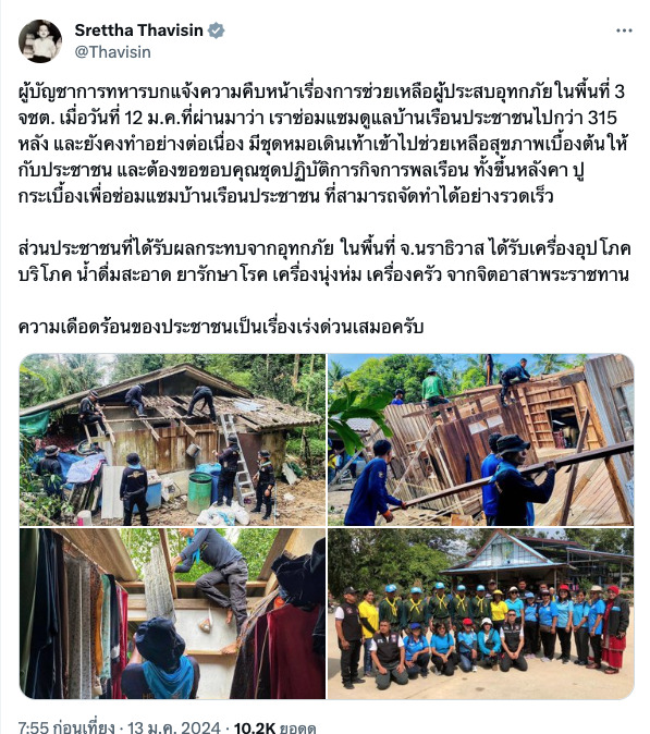 ผู้บัญชาการทหารบกแจ้งความคืบหน้าเรื่องการช่วยเหลือผู้ประสบอุทกภัยในพื้นที่ 3 จชต. เมื่อวันที่ 12 ม.ค.ที่ผ่านมาว่า เราซ่อมแซมดูแลบ้านเรือนประชาชนไปกว่า 315 หลัง และยังคงทำอย่างต่อเนื่อง มีชุดหมอเดินเท้าเข้าไปช่วยเหลือสุขภาพเบื้องต้นให้กับประชาชน และต้องขอขอบคุณชุดปฏิบัติการกิจการพลเรือน ทั้งขึ้นหลังคา ปูกระเบื้องเพื่อซ่อมแซมบ้านเรือนประชาชน ที่สามารถจัดทำได้อย่างรวดเร็ว