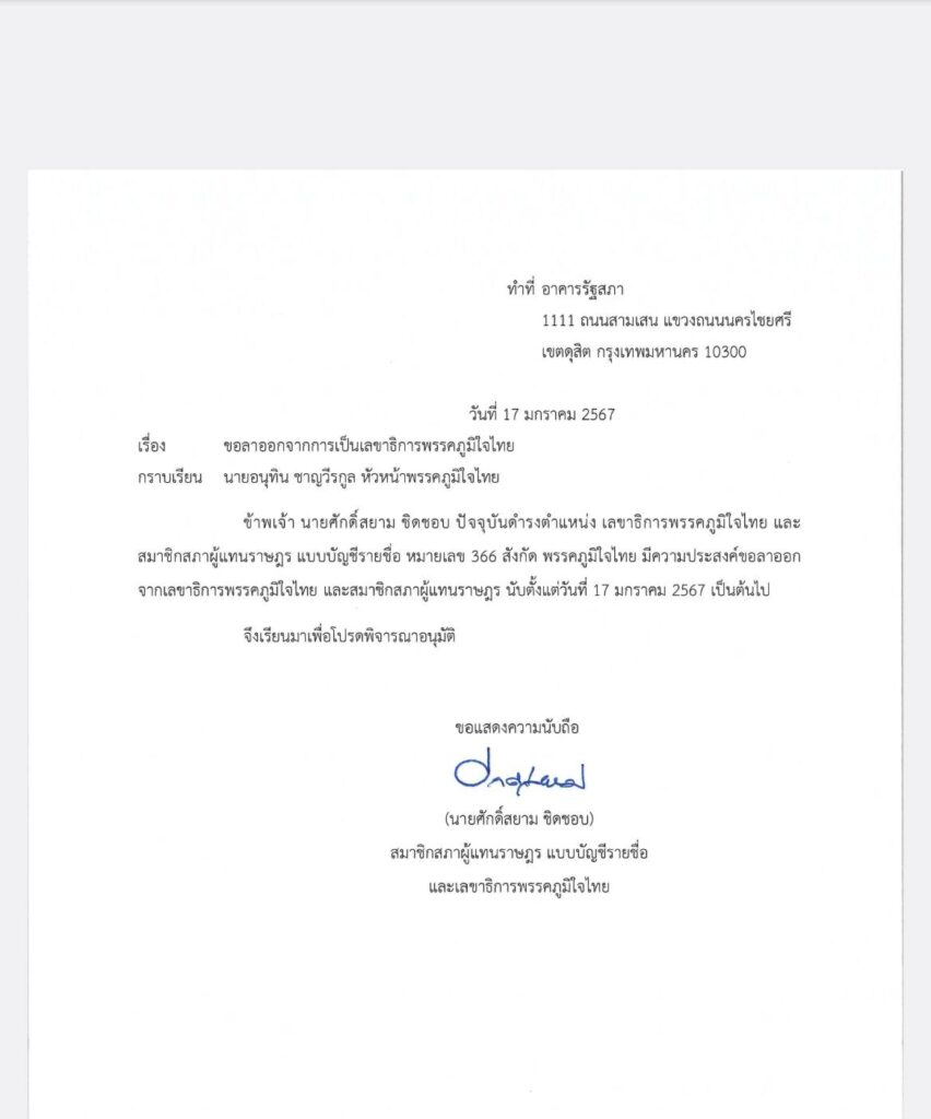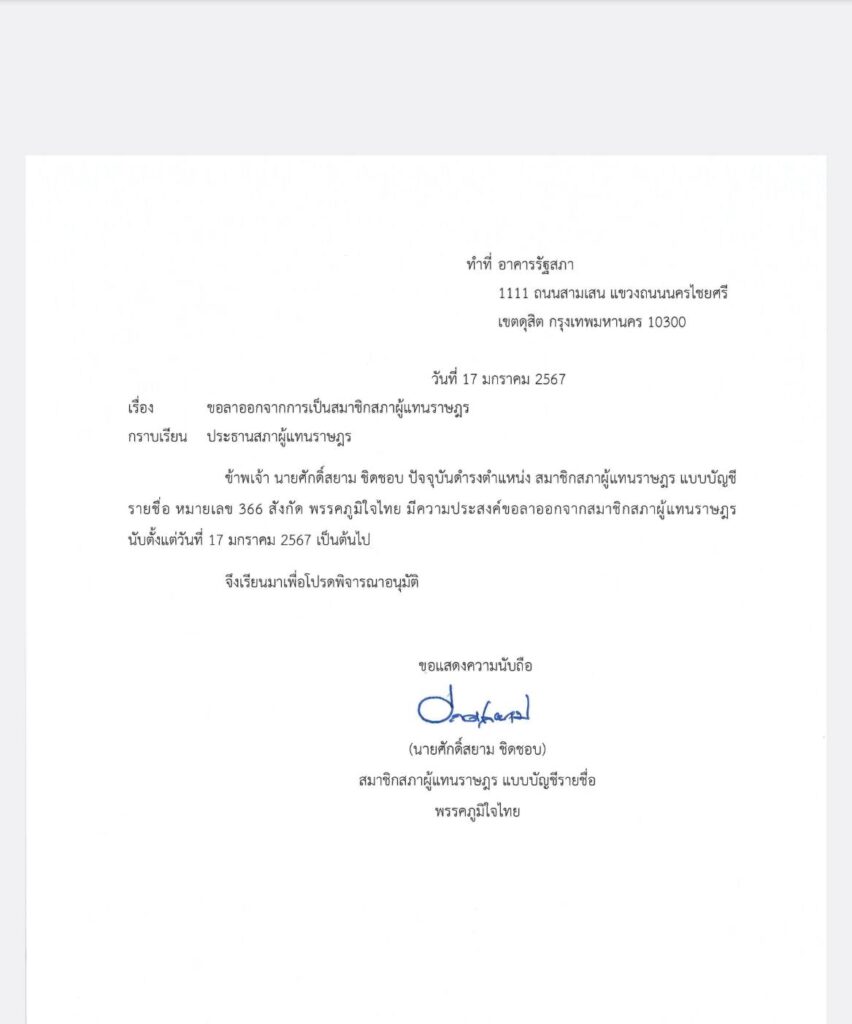 นอกจากนี้ ได้รับแจ้งจากนายศักดิ์สยาม ชิดชอบ ว่าได้ทำหนังสือลาออกจากการเป็นสมาชิกสภาผู้แทนราษฎร ต่อประธานสภาผู้แทนราษฎร ตั้งแต่วันที่ 17 มกราคม 2567 เป็นต้นไป ด้วย