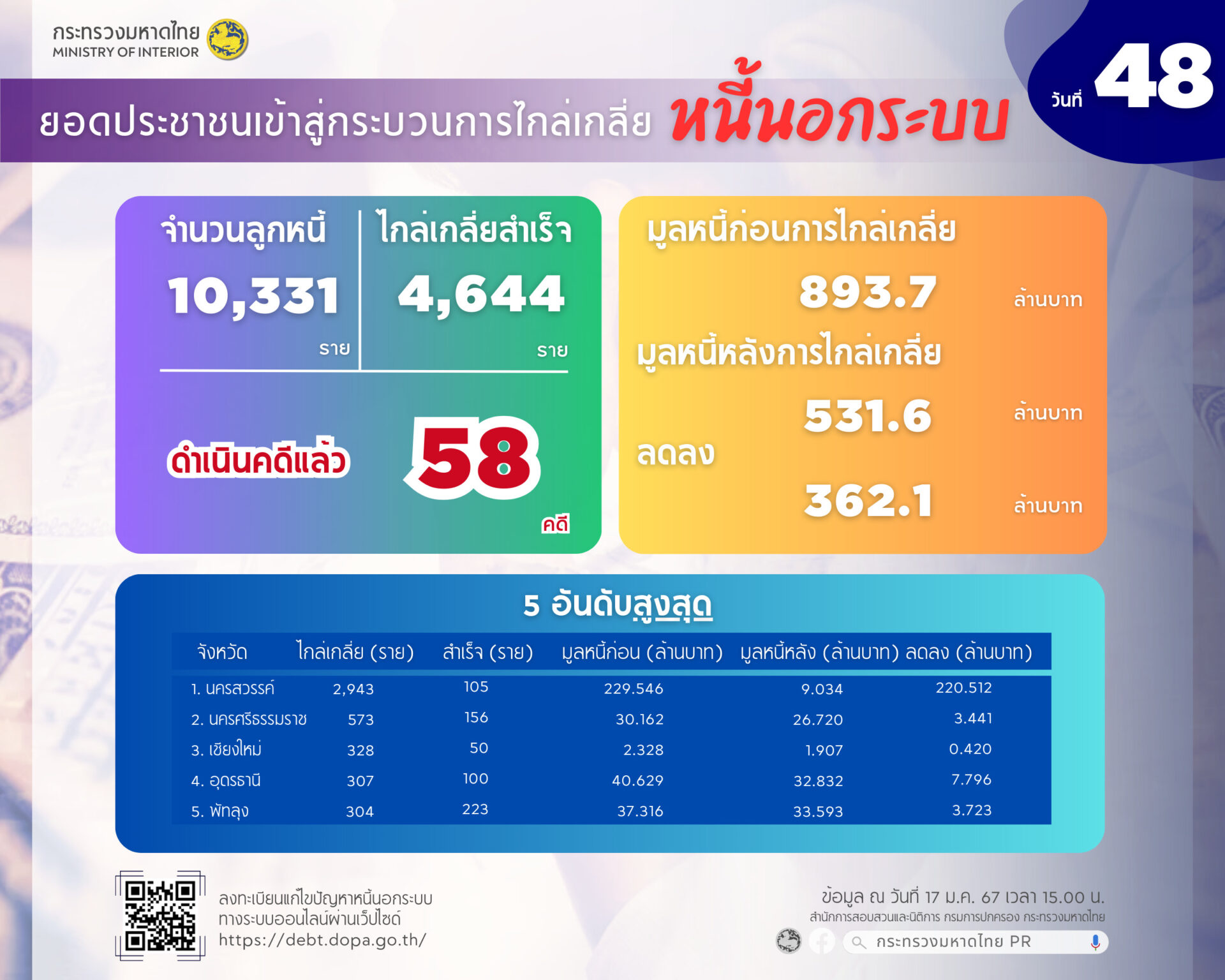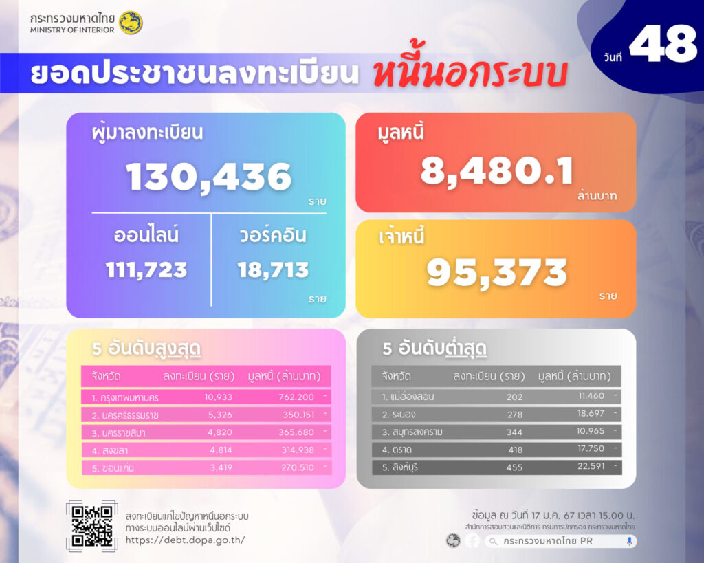 นาย สุทธิพงษ์ จุลเจริญ ปลัดกระทรวงมหาดไทย เปิดเผยถึงการลงทะเบียนแก้ไขปัญหาหนี้นอกระบบ เป็นวันที่ 48 นับตั้งแต่เปิดลงทะเบียนเมื่อวันที่ 1 ธันวาคม 2566 เป็นต้นมา โดยจากข้อมูลของสำนักการสอบสวนและนิติการ กรมการปกครอง เมื่อเวลา 15.00 น. มีมูลหนี้รวม 8,480.169 ล้านบาท ประชาชนลงทะเบียนแล้ว 130,436 ราย เป็นการลงทะเบียนผ่านระบบออนไลน์ 111,723 ราย และการลงทะเบียน ณ ศูนย์อำนวยการแก้ไขหนี้นอกระบบ 18,713 ราย รวมจำนวนเจ้าหนี้ 95,373 ราย มีพื้นที่/จังหวัดที่มีผู้ลงทะเบียนมากที่สุด 5 ลำดับแรก 1. กรุงเทพมหานคร ยังคงมากที่สุด มีผู้ลงทะเบียน 10,933 ราย เจ้าหนี้ 6,910 ราย มูลหนี้ 762.200 ล้านบาท 2. จังหวัดนครศรีธรรมราช มีผู้ลงทะเบียน 5,326 ราย เจ้าหนี้ 4,634 ราย มูลหนี้ 350.151 ล้านบาท 3. จังหวัดนครราชสีมา มีผู้ลงทะเบียน 4,820 ราย เจ้าหนี้ 3,195 ราย มูลหนี้ 365.680 ล้านบาท 4. จังหวัดสงขลา มีผู้ลงทะเบียน 4,814 ราย เจ้าหนี้ 3,605 ราย มูลหนี้ 314.938 ล้านบาท 5. จังหวัดขอนแก่น มีผู้ลงทะเบียน 3,419 ราย เจ้าหนี้ 2,784 ราย มูลหนี้ 270.510 ล้านบาท ขณะที่จังหวัดที่มีผู้ลงทะเบียนน้อยที่สุด 5 ลำดับแรก ได้แก่ 1. จังหวัดแม่ฮ่องสอน มีผู้ลงทะเบียน 202 ราย เจ้าหนี้ 186 ราย มูลหนี้ 11.460 ล้านบาท 2. จังหวัดระนอง มีผู้ลงทะเบียน 278 ราย เจ้าหนี้ 190 ราย มูลหนี้ 18.697 ล้านบาท 3. จังหวัดสมุทรสงคราม มีผู้ลงทะเบียน 344 ราย เจ้าหนี้ 255 ราย มูลหนี้ 10.965 ล้านบาท 4. จังหวัดตราด มีผู้ลงทะเบียน 418 ราย เจ้าหนี้ 313 ราย มูลหนี้ 17.750 ล้านบาท และ 5. จังหวัดสิงห์บุรี มีผู้ลงทะเบียน 455 ราย เจ้าหนี้ 321 ราย มูลหนี้ 22.591 ล้านบาท