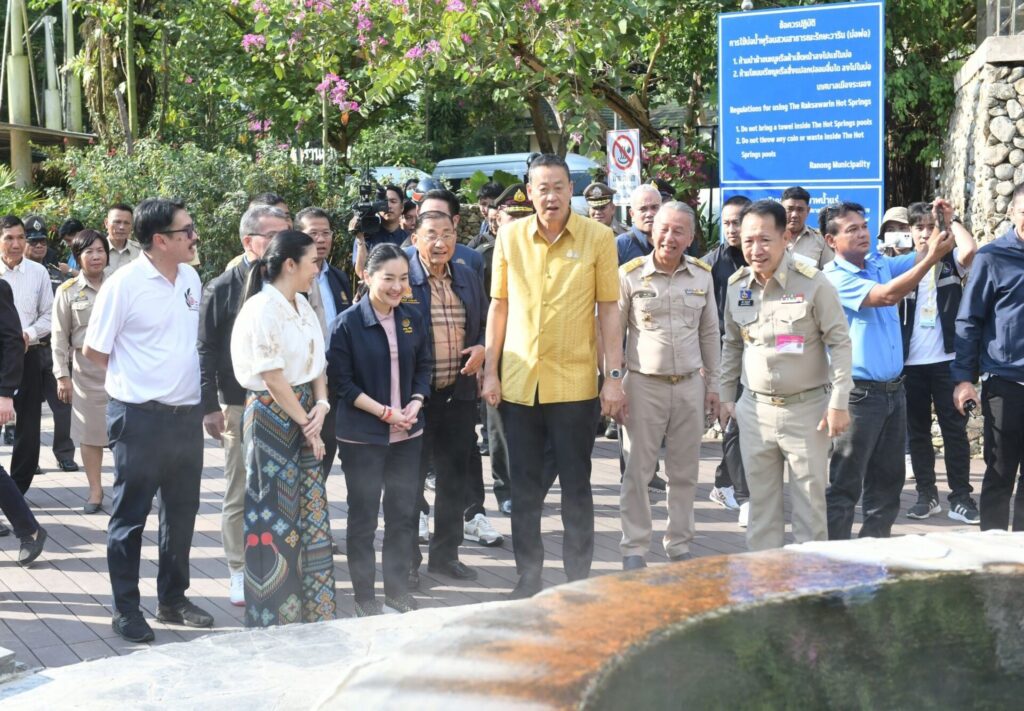 โดยเมื่อเดินทางถึงนายกฯ ได้ทักทายประชาชนที่มาแช่น้ำที่บ่อแร่ร้อน พร้อมเดินดูจุดบ่อน้ำพุร้อนตามจุดต่างๆ จากนั้นเยี่ยมชมร้านค้า ที่ขายภายในบริเวณบ่อน้ำแร่ร้อนรักษะวาริน