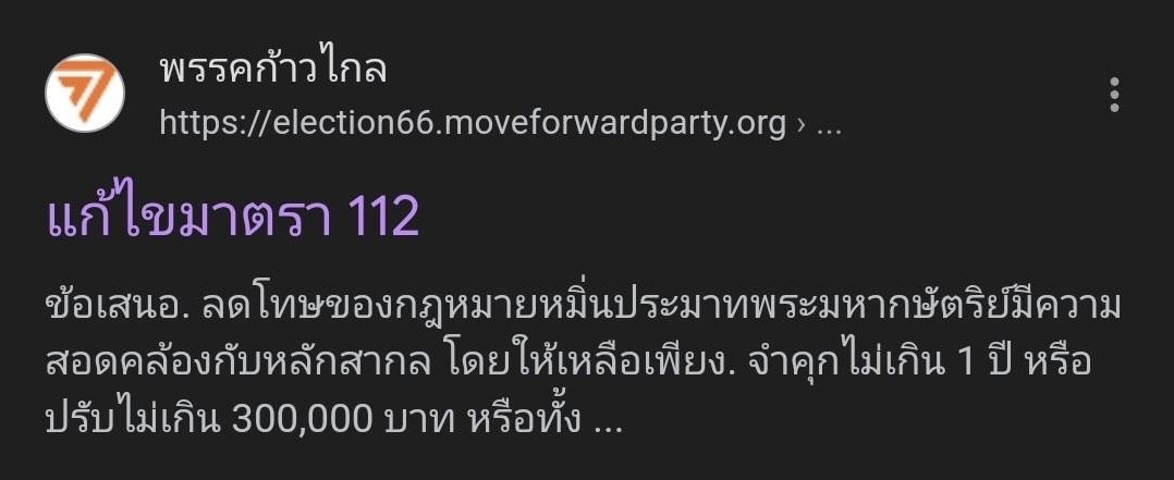 ทั้งนี้ แม้ไม่มีร่างที่จะแก้ไขเพิ่มเติมประมวลกฎหมายอาญามาตรา 112 ให้เห็นว่าจะแก้ไขในประเด็นใด เสนอมาพร้อมนโยบายพรรคผู้ถูกร้องที่ 2 แต่ตามเว็บไซต์ของผู้ถูกร้องที่ 2 กล่าวถึงการแก้ไขเพิ่มเติมประมวลกฎหมายอาญามาตรา 112 กลับมีเนื้อหาที่จะแก้ไขเพิ่มเติมประมวลกฎหมายอาญามาตรา 112 ทำนองเดียวกับร่างพระราชบัญญัติแก้ไขเพิ่มเติมประมวลกฎหมายอาญาฉบับที่ … พ.ศ. … แก้ไขเกี่ยวกับความผิดหมิ่นประมาท เมื่อวันที่ 25 มี.ค 64 ที่ยื่นต่อประธานสภาผู้แทนราษฎร”.-312.-สำนักข่าวไทย