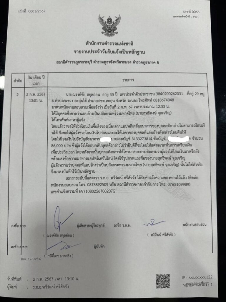 “ในกรณีนี้ เหตุการณ์ล่าสุด เมื่อช่วงเที่ยงของวันที่ 2 ก.พ. 67 มีเบอร์โทรศัพท์ติดต่อไปยังนายณรงค์ชัย สกุลอ่อน นายอำเภอกระบุรี จังหวัดระนอง ทางหมายเลขโทรศัพท์ประจำตำแหน่งนายอำเภอ พร้อมทั้งส่งข้อความผ่านทาง LINE ซึ่งมีการใช้รูปโปรไฟล์ของตน เพื่อลวงให้โอนเงิน โดยปลายสายได้แจ้งว่าให้ช่วยโอนเงินค่าซื้อสินค้า จำนวนเงิน 86,000 บาท อ้างว่าแอปพลิเคชันธนาคารไม่สามารถใช้การได้ และจะให้เลขานุการของตนโอนเงินคืนภายหลัง พร้อมให้เลขบัญชีธนาคาร แล้วได้โทรมาติดตามสอบถามเป็นระยะ ๆ ว่าได้โอนเงินไปให้หรือยังในเวลาใกล้เคียงกัน ซึ่งท่านนายอำเภอกระบุรีได้พิมพ์ข้อความพูดคุยเพื่อประวิงเวลา พร้อมเดินทางไปลงบันทึกประจำวัน ณ สถานีตำรวจภูธรกระบุรี และทำการทดลองโอนเงินจำนวน 1 บาท เพื่อเป็นหลักฐานไว้ ทั้งนี้ ในระหว่างที่ลงบันทึกประจำวันอยู่นั้น บุคคลดังกล่าวได้ใช้การสนทนาแบบ Video Call ทาง Line แต่ไม่ยอมเปิดกล้องแสดงตน จึงยิ่งทำให้มั่นใจว่าเป็นกลุ่มมิจฉาชีพแน่นอน จึงแจ้งความดำเนินคดีต่อตำรวจเพื่อให้ดำเนินการทางกฎหมายต่อไป”