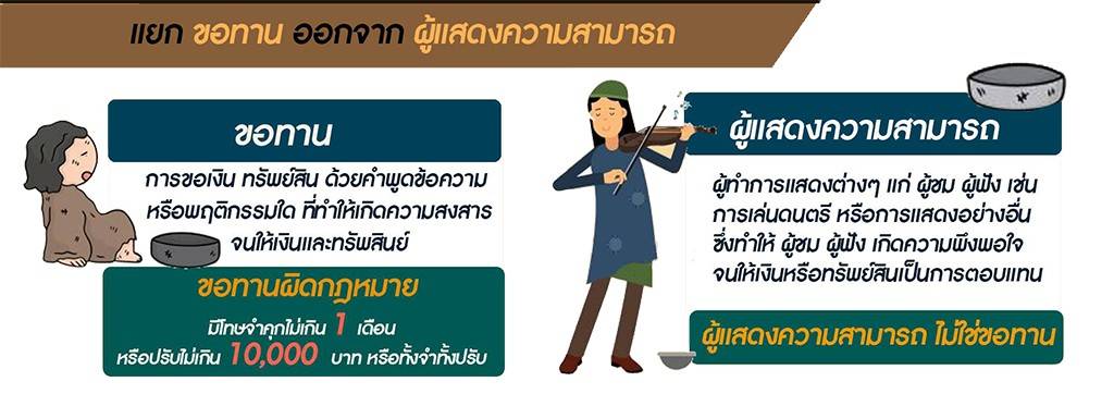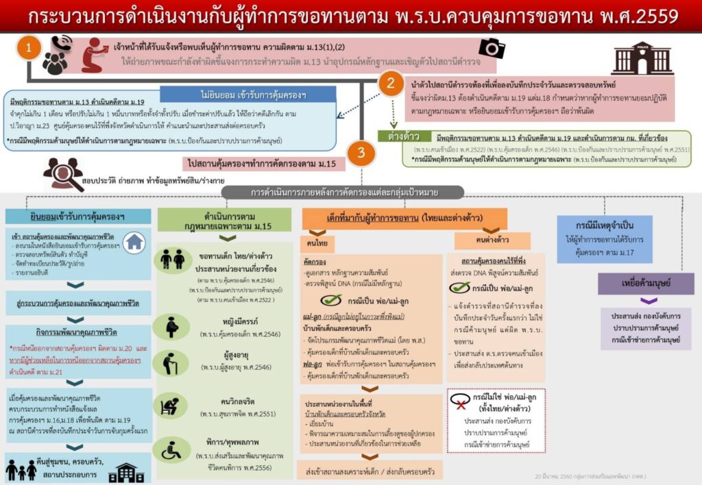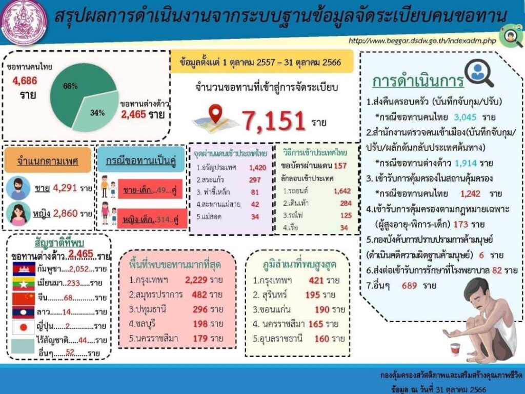 รองโฆษกประจำสำนักนายกรัฐมนตรีกล่าวว่า การขอทานถือเป็นการกระทำผิดกฎหมาย ต้องระวางโทษจำคุกไม่เกิน 1 เดือน หรือปรับไม่เกิน 10,000 บาท หรือทั้งจำทั้งปรับ และหากเป็นผู้ที่แสวงหาประโยชน์จากการขอทาน อัตราโทษจะหนักขึ้นด้วย ทั้งนี้ จากตัวเลขของกระทรวงการพัฒนาสังคมและความมั่นคงของมนุษย์ (พม.) ณ วันที่ 31 ตุลาคม 2566 พบว่ามีขอทานในประเทศไทยกว่า 7,151 คน เป็นคนไทย 4,686 คน และเป็นขอทานต่างด้าว 2,465 คน โดยกรุงเทพฯ เป็นพื้นที่ที่พบขอทานมากที่สุด ซึ่งในกรณีหากเป็นขอทานต่างด้าว เมื่อเจ้าหน้าที่พบเห็นหากมาคนเดียว จะดำเนินคดีและเมื่อสิ้นสุดคดีแล้ว จะดำเนินการส่งตัวกลับไปยังประเทศต้นทาง แต่หากมากับเด็ก จะดำเนินการตรวจสอบสารพันธุกรรม (DNA) เพื่อพิสูจน์ความสัมพันธ์ทางสายโลหิตก่อน และหากพบว่ามีความสัมพันธ์ทางสายโลหิตจะรายงานผลไปที่สถานีตำรวจในท้องที่กระทำความผิด เพื่อประสานส่งกลับประเทศต้นทาง แต่ในกรณที่ไม่มีความสัมพันธ์ทางสายโลหิต จะรายงานผล DNA ไปที่สถานีตำรวจในท้องที่กระทำความผิด เพื่อดำเนินการในส่วนที่เกี่ยวข้องต่อไป ตามมาตรา 22 พระราชบัญญัติควบคุมการขอทาน พ.ศ. 2559 กรณีผู้แสวงหาประโยชน์ หรือ พระราชบัญญัติป้องกันและปราบปรามการค้ามนุษย์