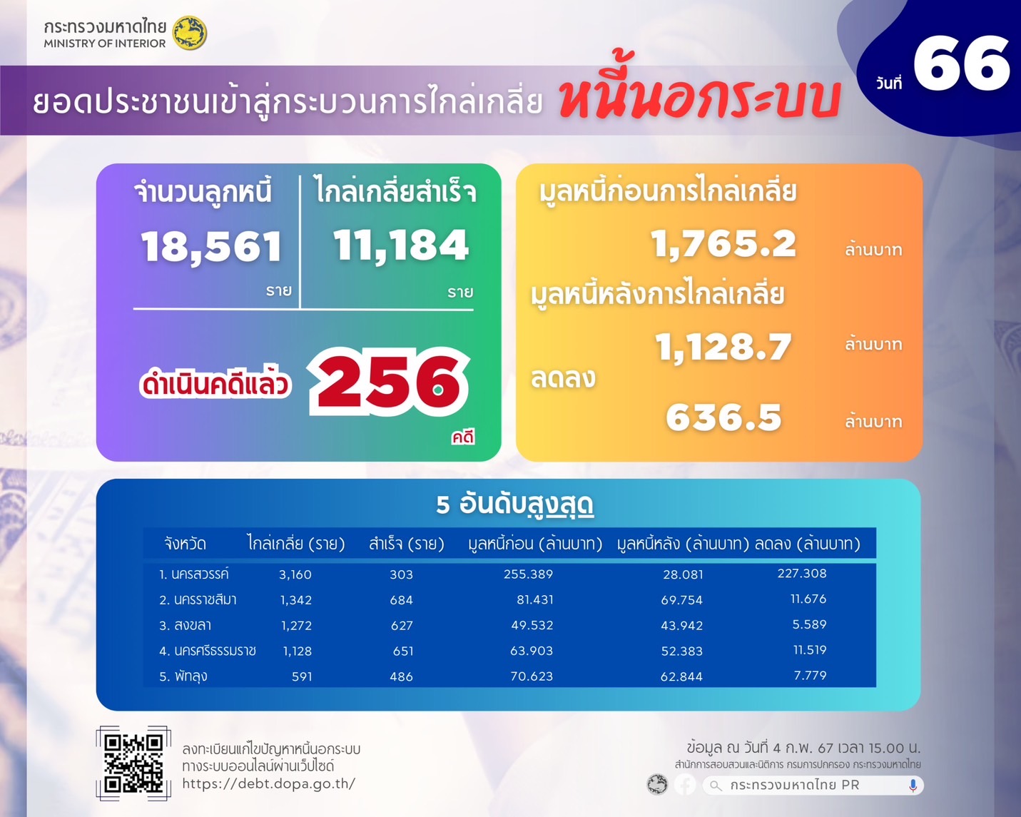 กรุงเทพฯ 4 ก.พ. – “มหาดไทย” เผยยอดลงทะเบียนวันที่ 66 มีมูลหนี้นอกระบบรวมกว่า 9,523 ล้านบาท ประชาชนลงทะเบียนแล้ว 1.38 แสนราย ไกล่เกลี่ยสำเร็จแล้ว 11,184 ราย มูลหนี้ลดลง 636 ล้านบาท เน้นย้ำทุกจังหวัดบูรณาการทุกกลไก เร่งเจรจาไกล่เกลี่ยประนอมหนี้