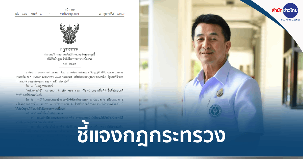 นายแพทย์ชลน่าน ศรีแก้ว รัฐมนตรีว่าการกระทรวงสาธารณสุข กล่าวว่า กฎกระทรวงกำหนดปริมาณยาเสพติดให้โทษและวัตถุออกฤทธิ์ ให้สันนิษฐานว่ามีไว้ในครอบครองเพื่อเสพ ที่ประกาศใช้เมื่อวันที่ 9 กุมภาพันธ์ที่ผ่านมา เป็นไปตามมติคณะรัฐมนตรี