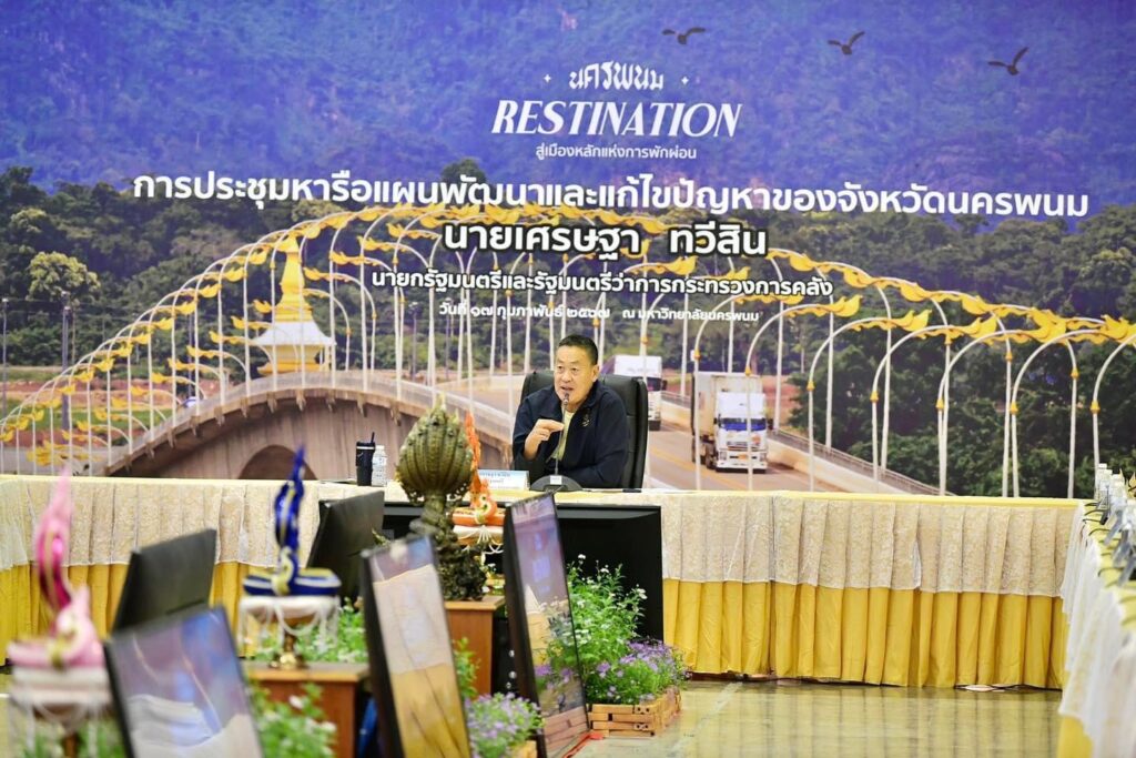 นายเศรษฐา ทวีสิน นายกรัฐมนตรีและรัฐมนตรีว่าการกระทรวงการคลัง เดินทางมายังจุดที่ 3 ประชุมหารือแผนพัฒนาและแก้ไขปัญหาของจังหวัดนครพนม ที่หอประชุมมหาวิทยาลัยนครพนม