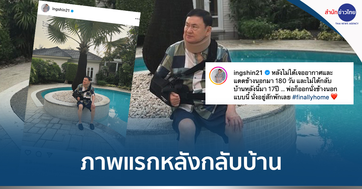 นางสาวแพทองธาร ชินวัตร หัวหน้าพรรคเพื่อไทย โพสต์ภาพแรกของนายทักษิณ ชินวัตร หลังกลับบ้านจันทร์ส่องหล้า โดยเป็นภาพนายทักษิณ นั่งอยู่ริมสระน้ำ ในชุดเดิมที่กลับจากโรงพยาบาล พร้อมระบุข้อความว่า “หลังไม่ได้เจออากาศและแดดข้างนอกมา 180 วัน และไม่ได้กลับบ้านหลังนี้มา 17 ปี พ่อก็ออกมานั่งข้างนอกแบบนี้ นั่งอยู่สักพักเลย” .-316. สำนักข่าวไทย