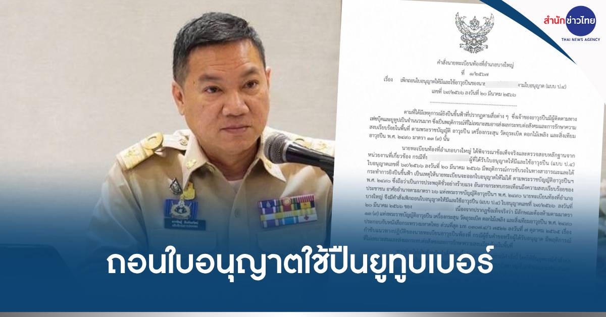 กทม. 20 ก.พ.-อธิบดีกรมการปกครอง เผยนายอำเภอบางใหญ่ เพิกถอนใบอนุญาตให้มีอาวุธปืนของยูทูบเบอร์ชื่อดังแล้ว หลังถ่ายคลิปยิงปืนขึ้นฟ้าโพสต์โซเชียล ท้าทายกฎหมาย