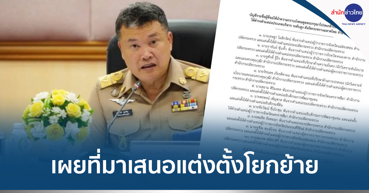 20 ก.พ. – ปลัดกระทรวงมหาดไทย เปิดเผยที่มาการเสนอแต่งตั้งโยกย้าย ภายหลังคณะรัฐมนตรีมีมติเห็นชอบโยกย้ายข้าราชการ ประเภทบริหาร ระดับสูงในสังกัดกระทรวงมหาดไทย รวม 10 ตำแหน่ง