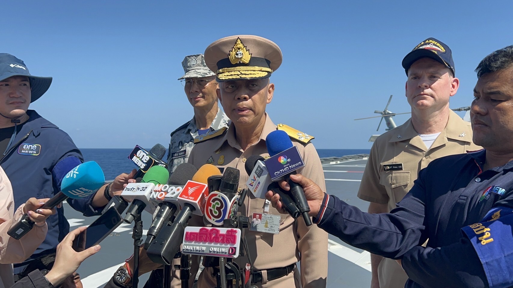 “จากการที่ไปสังเกตการปฏิบัติการบนเรือ Ocean valor ทำให้เข้าใจความยากลำบาก เพราะเรือOcean valor เป็นเรือเปล่า อุปกรณ์ทั้งหมดสหรัฐฯ นำขึ้นเครื่องบินมาจากรัฐฮาวายมาลงเรือ Ocean valor ที่สิงค์โปร์ เพื่อนำมาช่วยปฏิบัติภารกิจในครั้งนี้ ตนรู้สึกซาบซึ้งและขอขอบคุณ ขณะนี้นักประดาน้ำลงปฏิบัติภารกิจแล้ว และเตรียมจะขึ้นมา โดยนักประดาน้ำคนแรกเป็นกำลังพลของกองทัพเรือสหรัฐฯ คนที่สองเป็นคนไทย มีนักประดาน้ำสำรองอีก 1คน ของสหรัฐฯ เป็นไดร์แรก เมื่อขึ้นมาแล้วจะพัก จากนั้น นักประดาน้ำชุดต่อไป เป็นนักประดาน้ำกองทัพเรือไทยเป็นหลัก นักประดาน้ำสหรัฐและไทยจะเป็นตัวรอง โดยจะสลับกันเช่นนี้ชุดละ 3 คน โดย 2 คน อยู่ใต้น้ำ ส่วนอีก1คน เตรียมพร้อมอยู่ในที่ตั้ง กองทัพเรือไทยส่งนักประดาน้ำปฏิบัติภารกิจนี้ 35 นาย สหรัฐ 14 นาย” ผู้บัญชาการทหารเรือ กล่าว