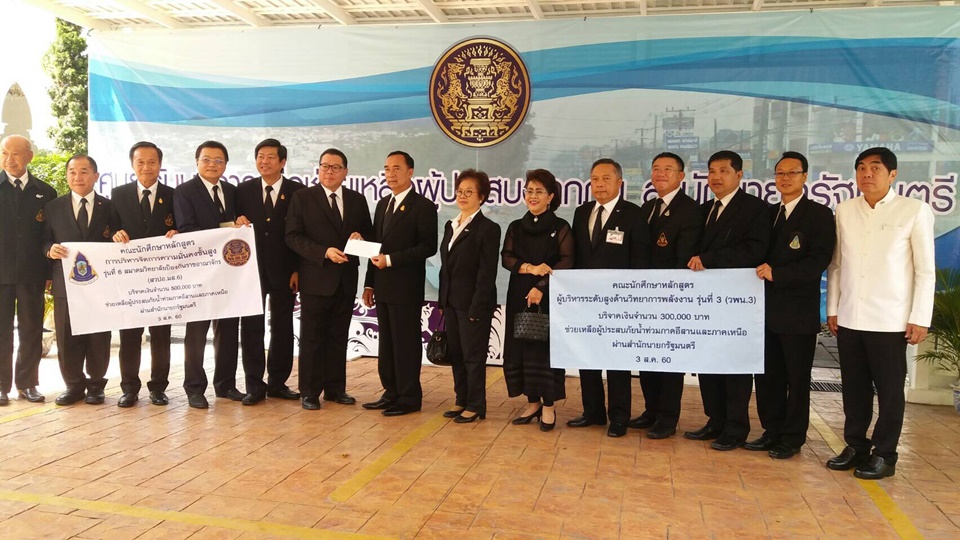 นายออมสิน ชีวะพฤกษ์ รัฐมนตรีประจำสำนักนายกรัฐมนตรี รับมอบเงินบริจาคช่วยเหลือผู้ประสบภัยน้ำท่วม ณ. ศูนย์รับบริจาคช่วยเหลือผู้ประสบภัยน้ำท่วม จากคณะนักศึกษาหลักสูตรการบริหารจัดการความมั่นคงขั้นสูงรุ่นที่ 6 (สวปอ.มส 6 ) จำนวน 500,000บาท และคณะนักศึกษาหลักสูตรผู้บริหารระดับสูงด้านวิชาการพลังงานรุ่นที่ 3 (วพน.3 ) จำนวนเงิน 300,000 บาท เพื่อนำไปช่วยเหลือผู้ประสบภัยน้ำท่วมในภาคอีสาน ซ่อมบำรุงและเยียวยาผู้ได้รับผลกระทบอุทกภัยครั้งใหญ่