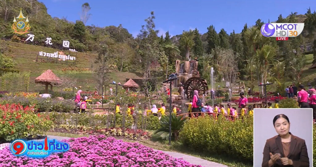 หลังทานอาหารที่ร้านปลานิลสายน้ำไหลเสร็จ นายกรัฐมนตรีก็มีกำหนดการจะเดินทางมาเยี่ยมชมสวนหมื่นบุปผาเป็นโครงการไม้เมืองหนาวอันเนื่องมาจากพระราชดำริ ในสมเด็จพระกนิษฐาธิราชเจ้า กรมสมเด็จพระเทพรัตนราชสุดา ตั้งอยู่ในหมู่บ้านปิยะมิตร 2 สร้างขึ้นจากความต้องการให้ประชาชนในพื้นที่เบตงได้มีอาชีพ มีรายได้ แทนการปลูกยางพาราเนื่องจากพื้นที่ตั้งอยู่สูงมากกว่า 850 เมตรไม่เหมาะแก่การปลูกยางพาราดังนั้นจึงมีการนำไม้เมืองหนาวมาปลูกทดแทน ซึ่งปัจจุบันได้รวบรวมพันธุ์ไม้เมืองหนาวเอาไว้มากกว่า 100 ชนิดรวมกว่า 30,000 ต้น โดย นาย โตหอง แซ่หลี่ ผู้จัดการสวนหมื่นบุปผาบอกว่า อักษรจีน คำว่า ว่านกั่วหยวน ที่เราเห็นอยู่ในสวนหมื่นบุปผาเป็นลายพระหัตถ์ของสมเด็จพระกนิษฐาธิราชเจ้า กรมสมเด็จพระเทพ ที่พระราชทานให้ค่ะซึ่งหากถอดความแปลเป็นภาษาไทยแปลว่า สวนหมื่นบุปผา