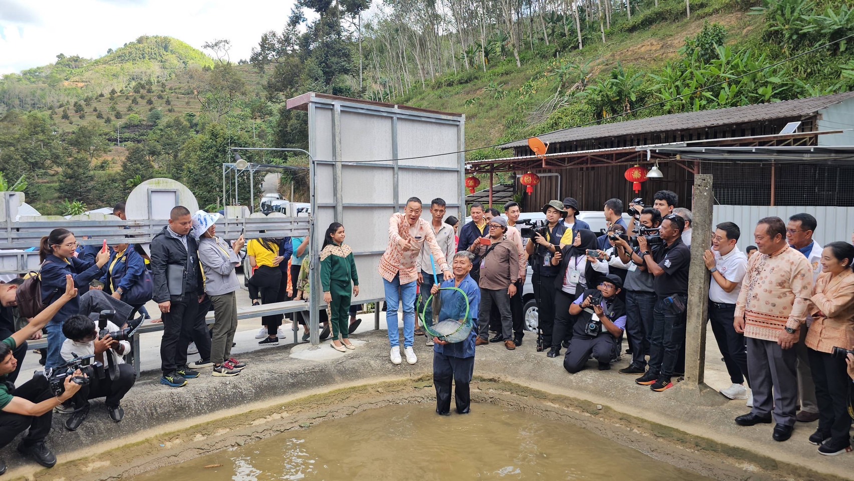 นายกรัฐมนตรีเดินชมบ่อเลี้ยงปลานิลสายน้ำไหล และรับฟังบรรยายสรุปการเพาะเลี้ยงปลานิลสายน้ำไหล และปลาพลวงชมพู จากนั้นนายกรัฐมนตรีร่วมให้อาหารปลาและชมการสาธิตจับปลาซึ่งหนัก 5 ถึง 6 กิโลกรัม โดยมีราคาต่อตัวประมาณ 3,600 บาท ซึ่งนายกรัฐมนตรีเชื่อว่าหากทำดี ๆ ปลาชนิดนี้เพิ่มมูลค่าได้กว่าเท่าตัวเป็นราคา 7,200 บาท