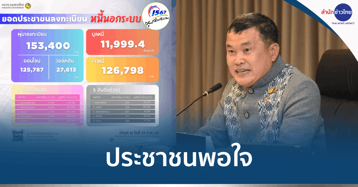 นายสุทธิพงษ์ จุลเจริญ ปลัดกระทรวงมหาดไทย เปิดเผยว่า กระทรวงมหาดไทยได้ดำเนินการรับลงทะเบียนประชาชนที่มีความประสงค์ขอให้ทางราชการได้ช่วยแก้ไขปัญหาหนี้นอกระบบตามนโยบายของรัฐบาล ภายใต้การนำของนายเศรษฐา ทวีสิน นายกรัฐมนตรี โดยนับตั้งแต่วันที่ 1 ธันวาคม 2566 ซึ่งเป็นวันแรกของการเปิดรับลงทะเบียน จนถึงวันที่ 29 กุมภาพันธ์ 2567 ซึ่งเป็นวันสุดท้ายของการเปิดรับลงทะเบียนในช่วงเวลา 23.59 น. มีประชาชนลงทะเบียนลงทะเบียนขอรับความช่วยเหลือแก้ไขปัญหาหนี้นอกระบบรวมทั้งสิ้นจำนวน 153,400 ราย แบ่งเป็นลงทะเบียนผ่านระบบออนไลน์ จำนวน 125,787 ราย ลงทะเบียน ณ หน่วยรับลงทะเบียนที่ศูนย์ดำรงธรรมจังหวัด ที่ว่าการอำเภอ และสำนักงานเขต จำนวน 27,613 ราย มูลหนี้รวม 11,999.44 ล้านบาท และมีเจ้าหนี้ จำนวน 126,798 ราย ซึ่งจากการรับฟังความคิดเห็นประชาชนพบว่า ประชาชนมีความพึงพอใจภาพรวมของการลงทะเบียนหนี้นอกระบบ และเป็นนโยบายที่ประชาชนมีความพึงพอใจเป็นลำดับต้น ๆ ในการแก้ไขปัญหาความทุกข์ยากเดือดร้อนของพี่น้องประชาชน