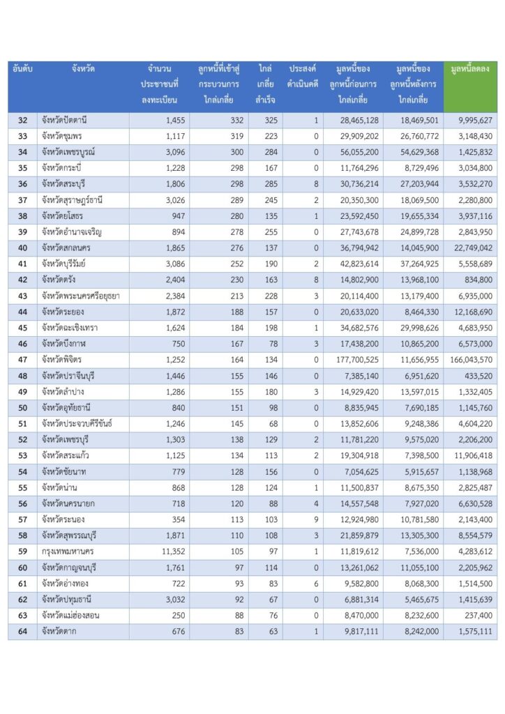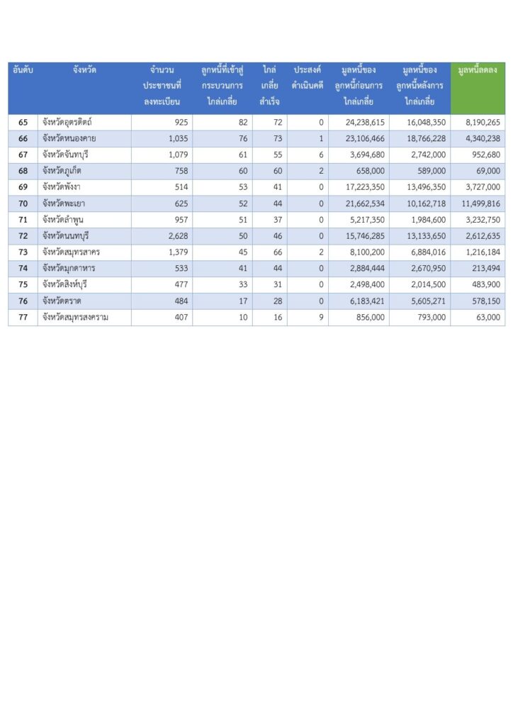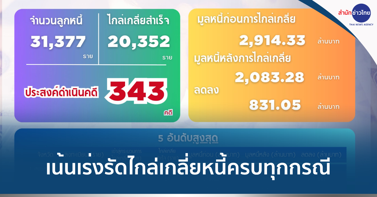 นายสุทธิพงษ์ จุลเจริญ ปลัดกระทรวงมหาดไทย เปิดเผยว่า จากการที่กระทรวงมหาดไทยได้เปิดรับลงทะเบียนให้ประชาชนที่มีความประสงค์ให้ทางราชการช่วยแก้ไขปัญหาหนี้นอกระบบตามนโยบายรัฐบาล โดยมีประชาชนมาลงทะเบียนรวมทั้งสิ้น 153,400 ราย กระทรวงมหาดไทยจึงได้แจ้งให้ทุกจังหวัด อำเภอ เดินหน้าแก้ไขปัญหาหนี้นอกระบบอย่างต่อเนื่องด้วยการเชิญเจ้าหนี้และลูกหนี้มาเข้าสู่กระบวนการเจรจาไกล่เกลี่ยหนี้ โดยเมื่อเวลา 15.00 น. สำนักการสอบสวนและนิติการ กรมการปกครอง ได้รายงานข้อมูลการไกล่เกลี่ยหนี้ทั่วประเทศ มีจำนวนลูกหนี้เข้าสู่กระบวนการไกล่เกลี่ยแล้ว 31,377 ราย สามารถไกล่เกลี่ยสำเร็จ 20,352 ราย มูลหนี้ลดลงรวม 831.050 ล้านบาท และมีกรณีที่เจ้าหนี้-ลูกหนี้มีความประสงค์ให้เจ้าหน้าที่ได้ส่งต่อเรื่องไปยังพนักงานสอบสวนของสถานีตำรวจในพื้นที่ดำเนินคดี 343 คดี โดยมีจังหวัดที่สามารถเชิญเจ้าหนี้-ลูกหนี้เข้าสู่กระบวนการไกล่เกลี่ยหนี้ได้มากที่สุด 5 ลำดับ คือ 1.จังหวัดสงขลา 3,179 ราย 2.จังหวัดนครสวรรค์ 2,669 ราย 3.จังหวัดนครราชสีมา 2,169 ราย 4.จังหวัดนครศรีธรรมราช 1,522 ราย และ 5.จังหวัดนราธิวาส 1,325 ราย ซึ่งเจ้าหนี้และลูกหนี้ได้มาพบปะพูดคุยกัน โดยมีเจ้าหน้าที่เป็นคนกลาง และหลังจากนี้หน่วยงานที่เกี่ยวข้องจะได้ติดตามผลภายหลังจากการเจรจาไกล่เกลี่ย เพื่อให้การแก้ไขปัญหาหนี้นอกระบบประสบความสำเร็จครบทั้งกระบวนการต่อไป