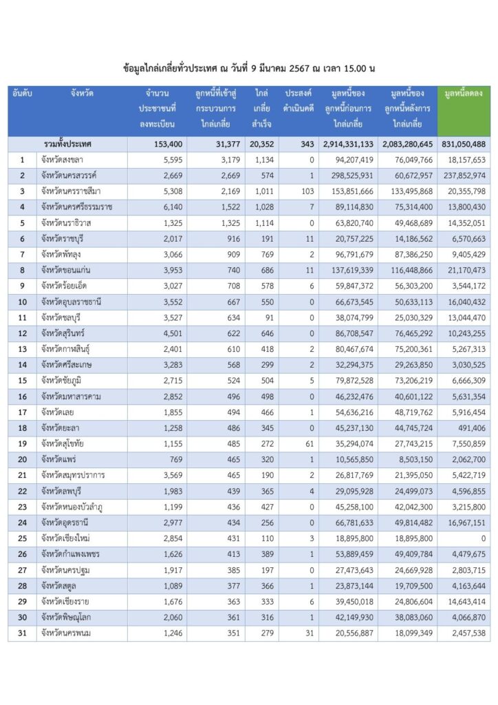 9 มี.ค. – มหาดไทย เผยความคืบหน้าการแก้ไขปัญหาหนี้นอกระบบ เข้าสู่กระบวนการไกล่เกลี่ยหนี้แล้ว 31,377 ราย สามารถไกล่เกลี่ยสำเร็จ 20,352 ราย มูลหนี้ลดลง 831 ล้านบาท เน้นย้ำทุกจังหวัดเร่งรัดดำเนินการไกล่เกลี่ยให้ครบทุกกรณีและเป็นธรรม