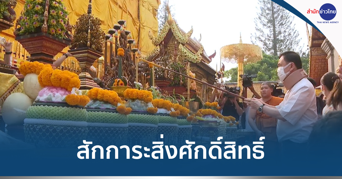 นายทักษิณได้ทักทายคนเสื้อแดงเล็กน้อย ก่อนจะสักการะอนุสาวรีย์ครูบาศรีวิชัย และเดินทางไปขึ้นสักการะพระบรมธาตุดอยสุเทพ สิ่งศักดิ์สิทธิ์คู่เมืองเชียงใหม่ ท่ามกลางกลุ่มคนรักทักษิณ และสื่อมวลชน ร่วมติดตามทำข่าวจำนวนมาก โดยนายทักษิณและครอบครัวได้สักการะสิ่งศักดิ์สิทธิ์ตามจุดต่างๆ บนวัดพระธาตุดอยสุเทพ โดยพระธรรมเสนาบดี เจ้าอาวาสวัดพระธาตุดอยสุเทพ นำนายทักษิณและครอบครัวเดินเวียนรอบพระธาตุ เพื่อความเป็นสิริมงคล