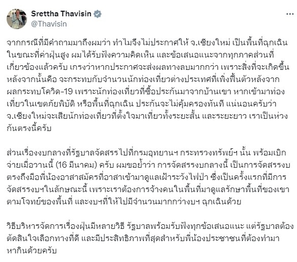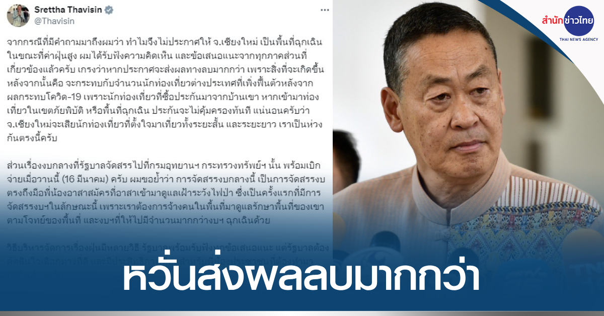 วันนี้ (17 มี.ค.) นายเศรษฐา ทวีสิน นายกรัฐมนตรีและรัฐมนตรีว่าการกระทรวงการคลัง โพสต์ข้อความผ่าน X ถึงประเด็นผลกระทบจากไฟป่าและ PM 2.5 ว่า “จากกรณีที่มีคำถามมาถึงผมว่า ทำไมจึงไม่ประกาศให้ จ.เชียงใหม่ เป็นพื้นที่ฉุกเฉิน ในขณะที่ค่าฝุ่นสูง ผมได้รับฟังความคิดเห็น และข้อเสนอแนะจากทุกภาคส่วนที่เกี่ยวข้องแล้วครับ เกรงว่าหากประกาศจะส่งผลทางลบมากกว่า เพราะสิ่งที่จะเกิดขึ้นหลังจากนั้นคือ จะกระทบกับจำนวนนักท่องเที่ยวต่างประเทศที่เพิ่งฟื้นตัวหลังจากผลกระทบโควิด-19 เพราะนักท่องเที่ยวที่ซื้อประกันมาจากบ้านเขา หากเข้ามาท่องเที่ยวในเขตภัยพิบัติ หรือพื้นที่ฉุกเฉิน ประกันจะไม่คุ้มครองทันที แน่นอนครับว่า จ.เชียงใหม่ จะเสียนักท่องเที่ยวที่ตั้งใจมาเที่ยวทั้งระยะสั้น และระยะยาว เราเป็นห่วงกันตรงนี้ครับ