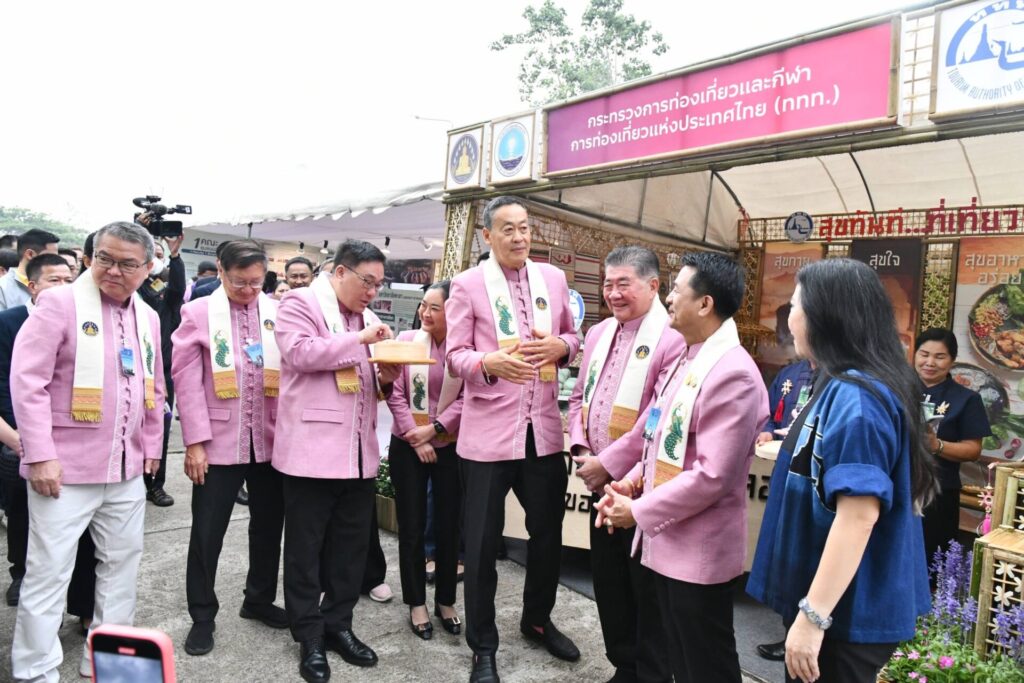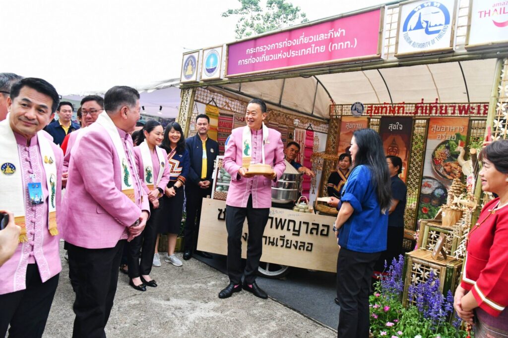 นายกรัฐมนตรีเดิมชมบูธของหน่วยงานต่าง ๆ ที่นำผลิตภัณฑ์ท้องถิ่นมาจัดแสดง อาทิ ผ้าพื้นเมือง ผลผลิตทางการเกษตร เมล็ดกาแฟ ขณะที่ช่วงหนึ่งระหว่างการเยี่ยมชมบูธของการท่องเที่ยวแห่งประเทศไทย (ททท. ) กระทรวงการท่องเที่ยวและกีฬา น.ส.ฐาปนีย์ เกียรติไพบูลย์ ผู้ว่าฯ ททท.รายงานความคืบหน้าการเปิดสำนักงานททท.จังหวัดพะเยา ซึ่งนายกรัฐมนตรีกำชับว่า ขอให้เปิดสำนักงานฯให้ทันก่อนฤดูหนาว ซึ่งจะสอดรับกับฤดูการท่องเที่ยวของภาคเหนือ