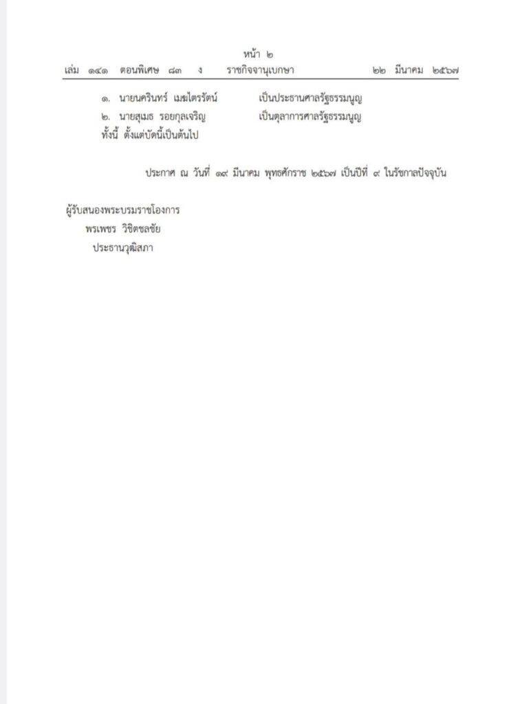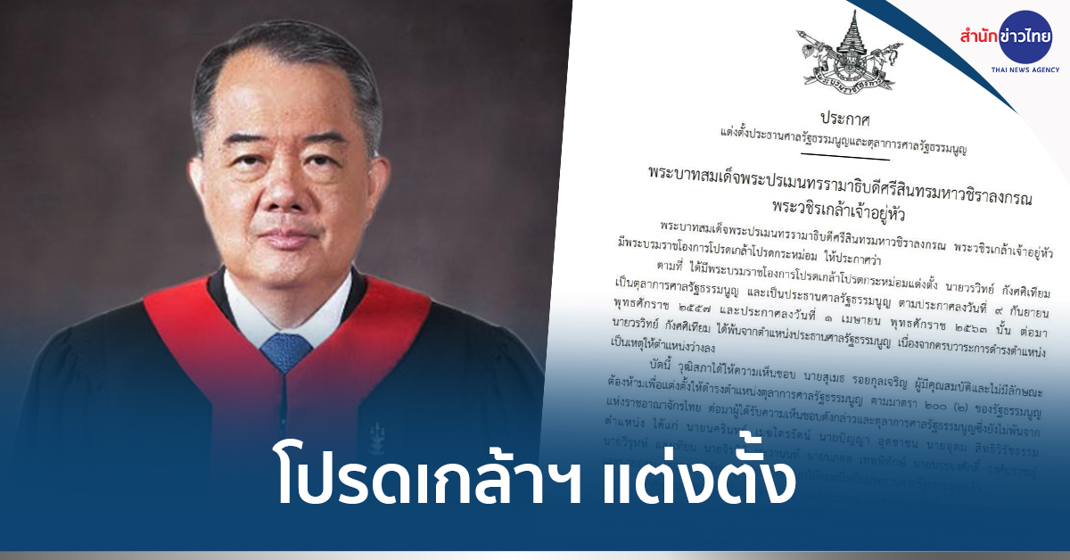 22 มี.ค.- โปรดเกล้าฯ แต่งตั้ง “นครินทร์ เมฆไตรรัตน์” ประธานศาลรัฐธรรมนูญคนใหม่ และ “สุเมธ รอยกุลเจริญ” เป็นตุลาการศาลรัฐธรรมนูญ