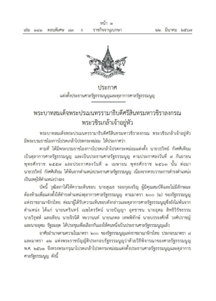 อาศัยอำนาจตามความในมาตรา 200 ของรัฐธรรมนูญแห่งราชอาณาจักรไทย ประกอบมาตรา 8 และมาตรา 12 แห่งพระราชบัญญัติประกอบรัฐธรรมนูญว่าด้วยวิธีพิจารณาของศาลรัฐธรรมนูญ พ.ศ. 2561 จึงทรงพระกรุณาโปรดเกล้าโปรดกระหม่อมแต่งตั้งประธานศาลรัฐธรรมนูญและตุลาการศาลรัฐธรรมนูญ ดังนี้