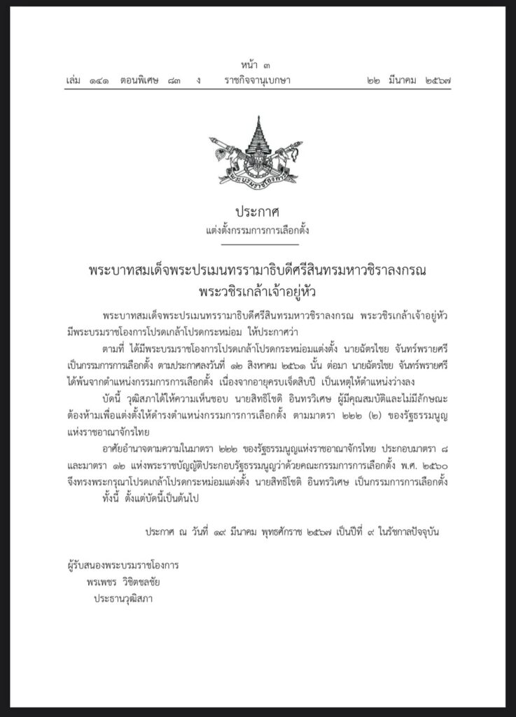 จึงทรงพระกรุณโปรดเกล้าโปรดกระหม่อมแต่งตั้ง นายสิทธิโชติ อินทรวิเศษ เป็นกรรมการการเลือกตั้ง ทั้งนี้ ตั้งแต่บัดนี้เป็นต้นไป ประกาศ ณ วันที่ 19 มีนาคม พุทธศักราช 2567