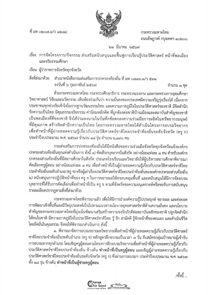 นายสุทธิพงษ์ จุลเจริญ ปลัดกระทรวงมหาดไทย เปิดเผยว่า กระทรวงมหาดไทยได้ดำเนินโครงการอบรมวิทยากรเพื่อทำหน้าที่ผู้ถ่ายทอดความรู้เกี่ยวกับประวัติศาสตร์ชาติไทยประจำท้องถิ่นระดับจังหวัด (ครู ก) ประจำปีงบประมาณ พ.ศ. 2567 จำนวน 18 รุ่น จำนวน 2,190 คน สอดคล้องกับยุทธศาสตร์ชาติด้านความมั่นคง นโยบายกระทรวงมหาดไทย และบันทึกข้อตกลงความร่วมมือระหว่างกระทรวงมหาดไทย กระทรวงศึกษาธิการ กระทรวงแรงงาน และกระทรวงการอุดมศึกษา วิทยาศาสตร์ วิจัยและนวัตกรรม มุ่งหวังผลิตทรัพยากรมนุษย์ที่มีคุณภาพ สร้างจิตสำนึกความเป็นไทย หนุนเสริมความมั่นคงของประเทศให้มีความเจริญรุ่งเรือง เพราะการที่พี่น้องประชาชนทุกช่วงวัยเข้าใจในรากฐานวัฒนธรรมไทย และเกิดความรัก ความผูกพัน ความภาคภูมิใจในประวัติศาสตร์ชาติไทย มีคุณธรรม จริยธรรม เป็นพลเมืองที่ดีของประเทศ