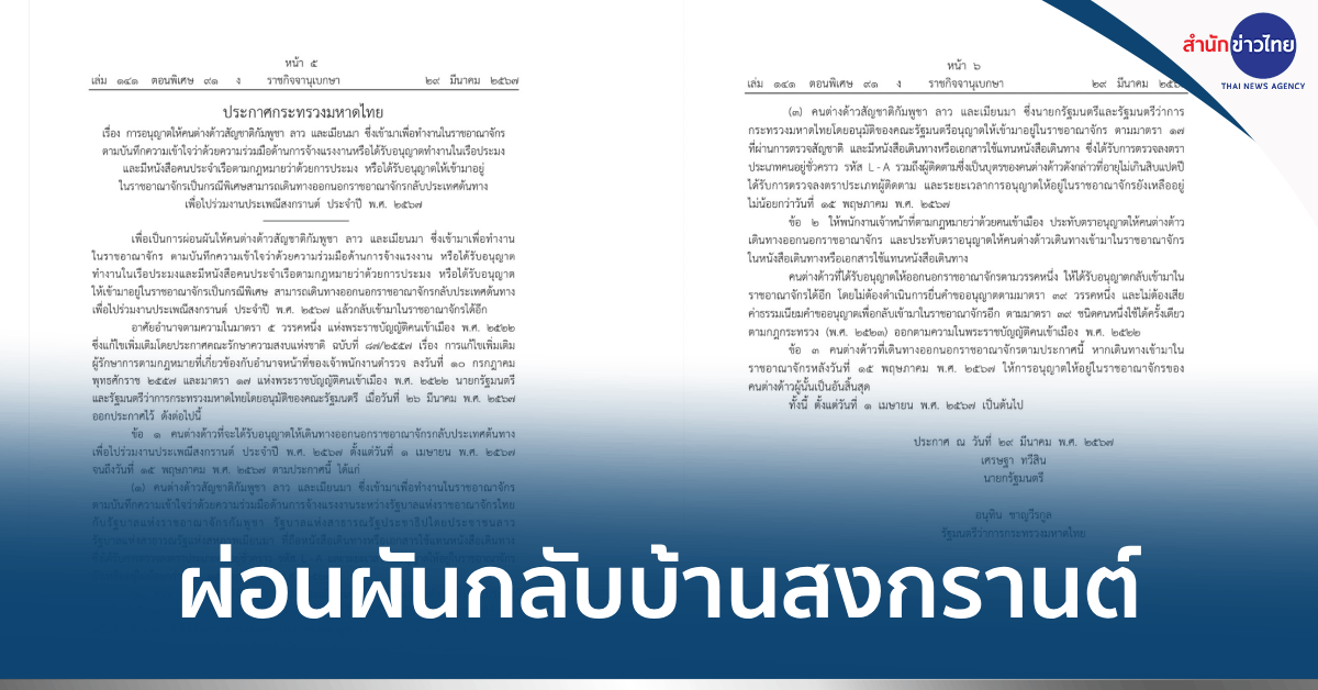 “นายเศรษฐา ทวีสิน นายกรัฐมนตรีและ รมว.คลัง และนายอนุทิน ชาญวีรกูล รองนายกรัฐมนตรีและรมว.มหาดไทย ได้ลงนามในกระทรวงมหาดไทยฉบับนี้ โดยการอนุมัติของคณะรัฐมนตรี เมื่อวันที่ 26 มี.ค. 67 หลังจากประกาศในราชกิจจานุเบกษาในวันนี้ (29 มี.ค.) แล้ว ประกาศจะเริ่มมีผลตั้งแต่วันที่ 1 เม.ย. เป็นต้นไป เป็นไปตามนโยบายที่รัฐบาลต้องการสนับสนุนให้แรงงานจากประเทศเพื่อนบ้านซึ่งมีวัฒนธรรมใกล้เคียงกับประเทศไทยได้มีโอกาสเดินทางกลับบ้านไปร่วมงานประเพณีสงกรานต์ เยี่ยมเยียนครอบครัว รวมทั้งได้ช่วยเหลือลดภาระค่าใช้จ่ายให้กับแรงงานต่างด้าวซึ่งส่วนใหญ่เป็นกลุ่มคนที่มีรายได้ไม่สูงมากนักให้เดินทางได้โดยสะดวก และเป็นการรักษาความสัมพันธ์อันดีระหว่างไทยกับประเทศเพื่อนบ้านด้วย” น.ส.ไตรศุลี กล่าว
