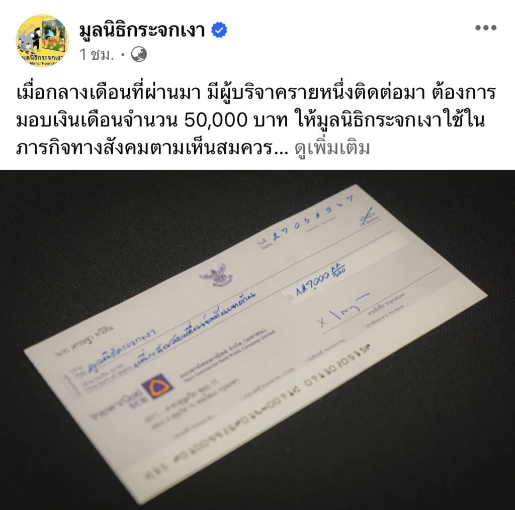 ผู้สื่อข่าวรายงานว่า เพจเฟซบุ๊กมูลนิธิกระจกเงา โพสต์ภาพเช็คเงินพร้อมข้อความ ระบุว่า เมื่อกลางเดือนที่ผ่านมา มีผู้บริจาครายหนึ่งติดต่อมา ต้องการมอบเงินเดือนจำนวน 50,000 บาท ให้มูลนิธิกระจกเงาใช้ในภารกิจทางสังคมตามเห็นสมควร