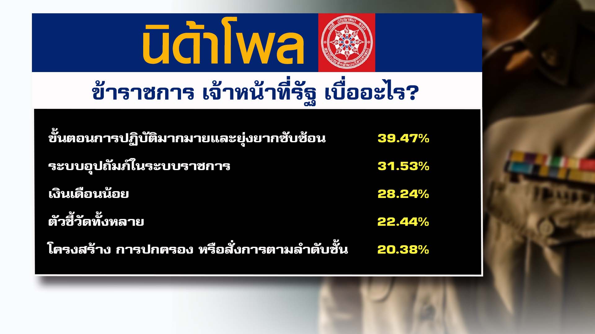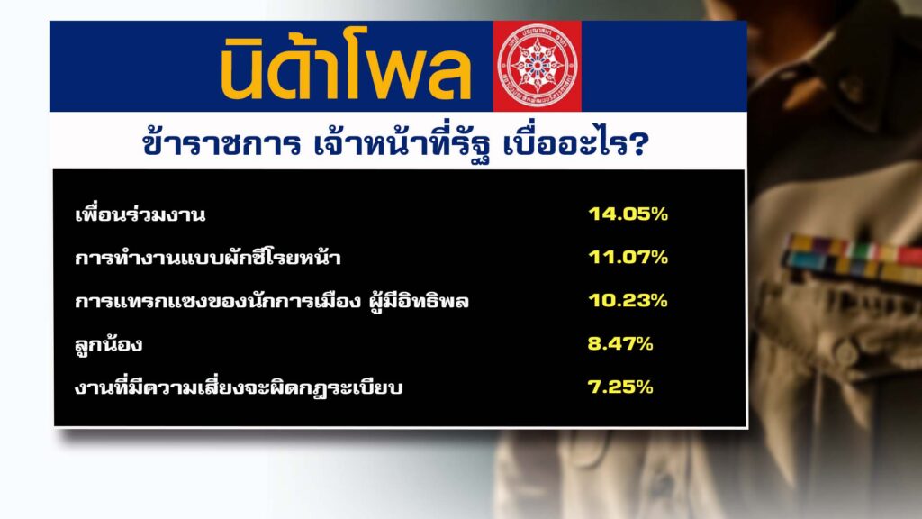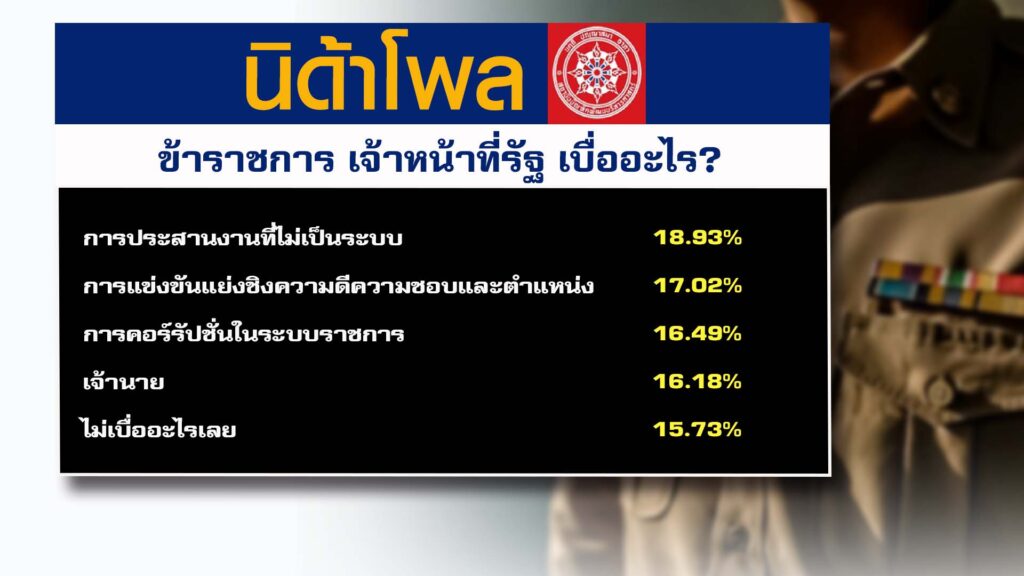 กทม. 31 มี.ค.- ศูนย์สำรวจความคิดเห็น “นิด้าโพล” เผยผลสำรวจประชาชน เรื่อง “ข้าราชการ เจ้าหน้าที่รัฐ เบื่ออะไร?” เกี่ยวกับความรู้สึกเบื่อของข้าราชการและเจ้าหน้าที่รัฐต่อระบบราชการไทย