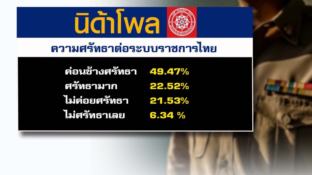 ด้านความศรัทธาต่อระบบราชการไทย พบว่า ตัวอย่าง ร้อยละ 49.47 ระบุว่า ค่อนข้างศรัทธา รองลงมา ร้อยละ 22.52 ระบุว่า ศรัทธามาก ร้อยละ 21.53 ระบุว่า ไม่ค่อยศรัทธา ร้อยละ 6.34 ระบุว่า ไม่ศรัทธาเลย