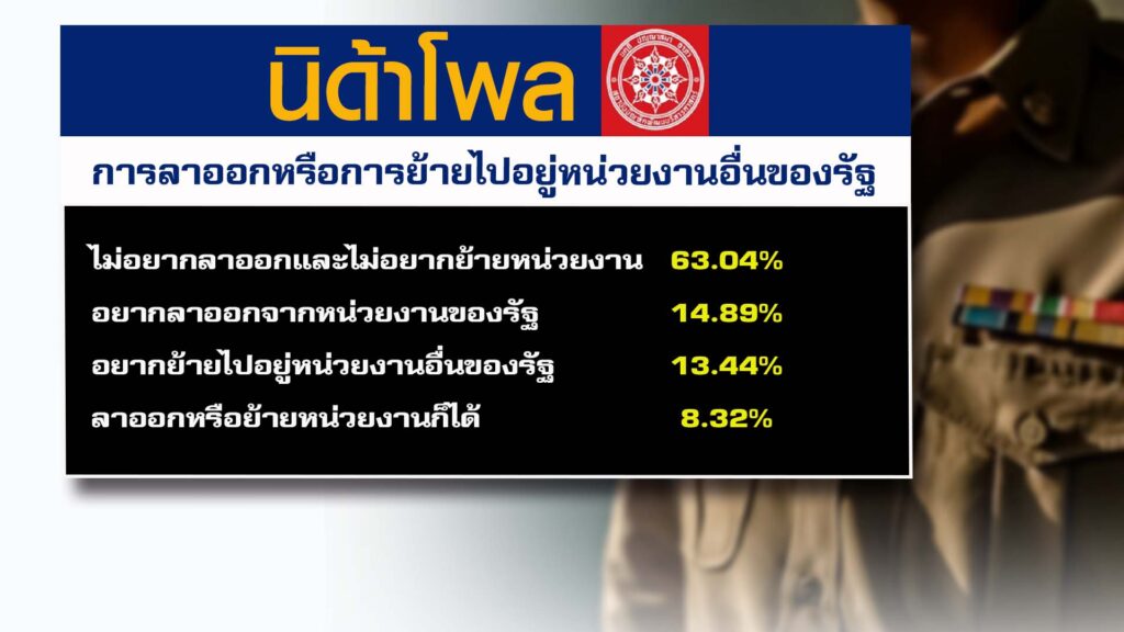 ท้ายที่สุดเมื่อถามความคิดเห็นเกี่ยวกับการลาออก หรือการย้ายไปอยู่หน่วยงานอื่นของรัฐ พบว่า ตัวอย่าง ร้อยละ 63.04 ระบุว่า ไม่อยากลาออกและไม่อยากย้ายหน่วยงาน รองลงมา ร้อยละ 14.89 ระบุว่า อยากลาออกจากหน่วยงานของรัฐ ร้อยละ 13.44 ระบุว่า อยากย้ายไปอยู่หน่วยงานอื่นของรัฐ ร้อยละ 8.32 ระบุว่า ลาออกหรือย้ายหน่วยงานก็ได้ .-สำนักข่าวไทย
