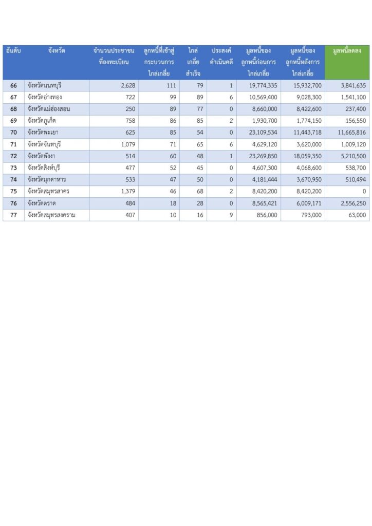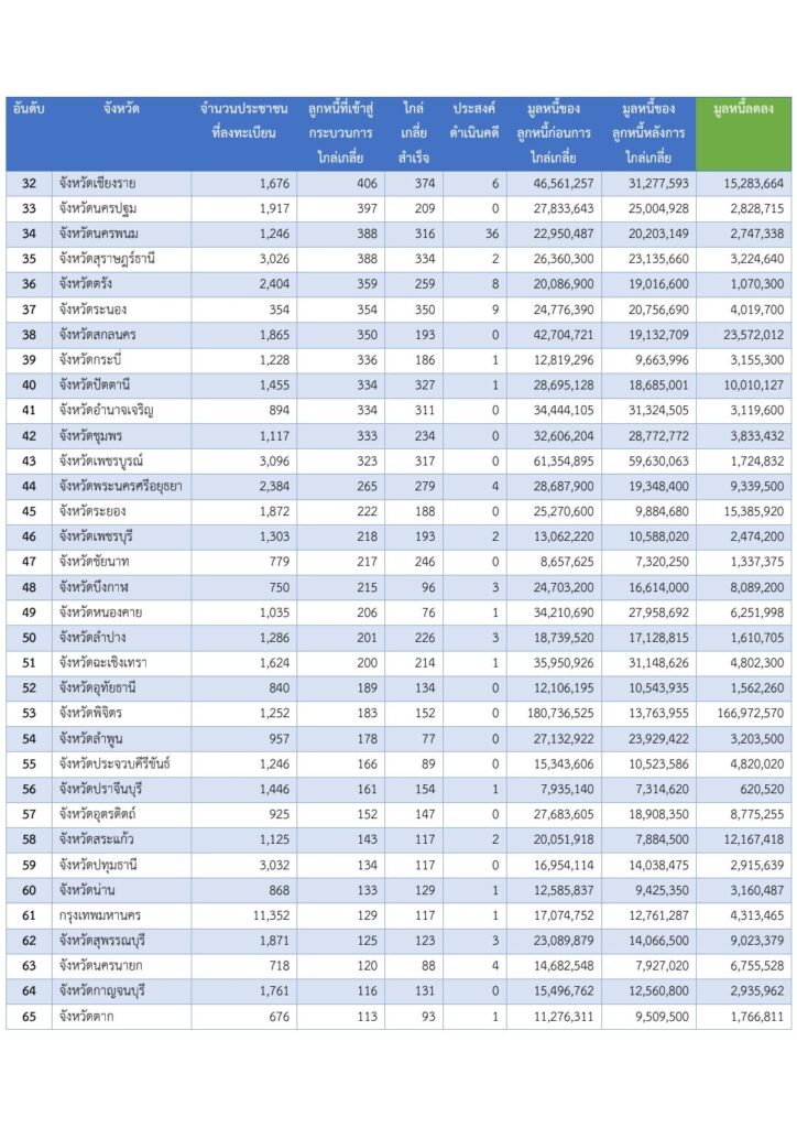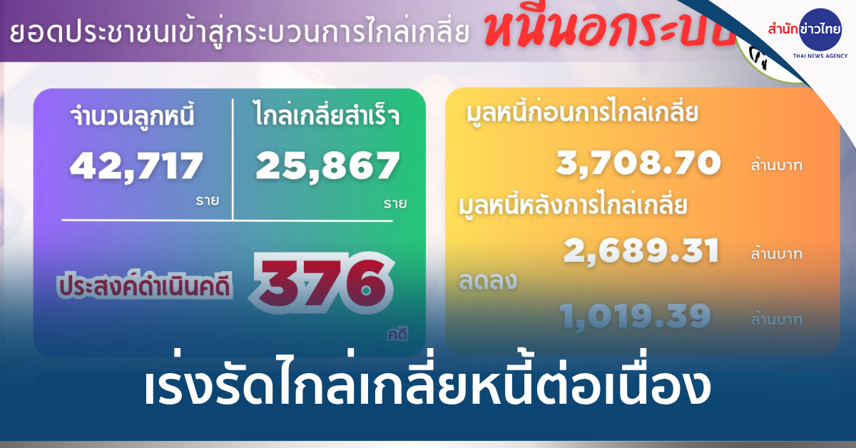 โดยเมื่อเวลา 15.00 น. สำนักการสอบสวนและนิติการ กรมการปกครอง รายงานข้อมูลการไกล่เกลี่ยหนี้ทั่วประเทศมีจำนวนลูกหนี้เข้าสู่กระบวนการไกล่เกลี่ยแล้ว 42,717 ราย สามารถไกล่เกลี่ยสำเร็จ 25,867 ราย มูลหนี้ลดลงรวม 1,019.397 ล้านบาท และมีกรณีที่เจ้าหนี้-ลูกหนี้มีความประสงค์ให้เจ้าหน้าที่ได้ส่งต่อเรื่องไปยังพนักงานสอบสวนของสถานีตำรวจในพื้นที่ดำเนินคดี 376 คดี โดยมีจังหวัดที่สามารถเชิญเจ้าหนี้-ลูกหนี้เข้าสู่กระบวนการไกล่เกลี่ยหนี้ได้มากที่สุด 5 ลำดับ คือ 1.จังหวัดสงขลา 4,378 ราย 2.จังหวัดนครศรีธรรมราช 3,478 ราย 3.จังหวัดนครสวรรค์ 2,669 ราย 4.จังหวัดศรีสะเกษ 2,343 ราย และ 5.จังหวัดนครราชสีมา 2,269 ราย ซึ่งเจ้าหนี้และลูกหนี้ได้มาพบปะพูดคุยกัน โดยมีเจ้าหน้าที่เป็นคนกลาง และหลังจากนี้หน่วยงานที่เกี่ยวข้องจะได้ติดตามผลภายหลังจากการเจรจาไกล่เกลี่ยหนี้ เพื่อให้การแก้ไขปัญหาหนี้นอกระบบประสบความสำเร็จครบทั้งกระบวนการต่อไป