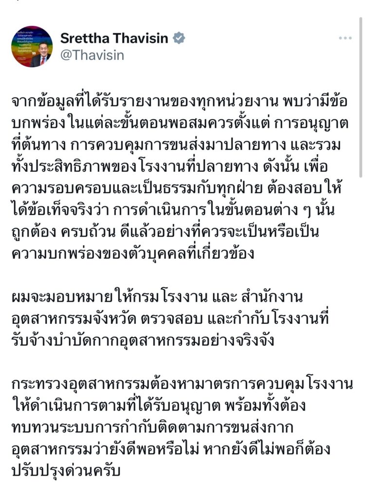 ผมจะมอบหมายให้กรมโรงงาน และสำนักงานอุตสาหกรรมจังหวัด ตรวจสอบ และกำกับโรงงานที่รับจ้างบำบัดกากอุตสาหกรรมอย่างจริงจัง