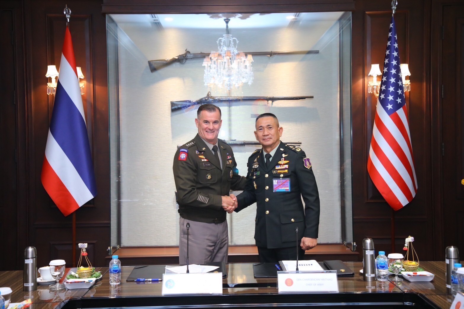 พลเอก เจริญชัย หินเธาว์ ผู้บัญชาการทหารบก ให้การต้อนรับ พลเอก ชาร์ลส์ เอ ฟลินน์ (General Charles A. Flynn) ผู้บัญชาการกองกำลังทางบกสหรัฐฯ ภาคพื้นแปซิฟิกในโอกาสเดินทางเข้าเยี่ยมคำนับผู้บัญชาการทหารบก เพื่อเจรจาทำงาน (Working Visit) ณ กองบัญชาการกองทัพบก โดยกองทัพบกจัดพิธีตรวจแถวทหารกองเกียรติยศ และนำเยี่ยมชมอาคารพิพิธภัณฑ์กองทัพบกเฉลิมพระเกียรติ