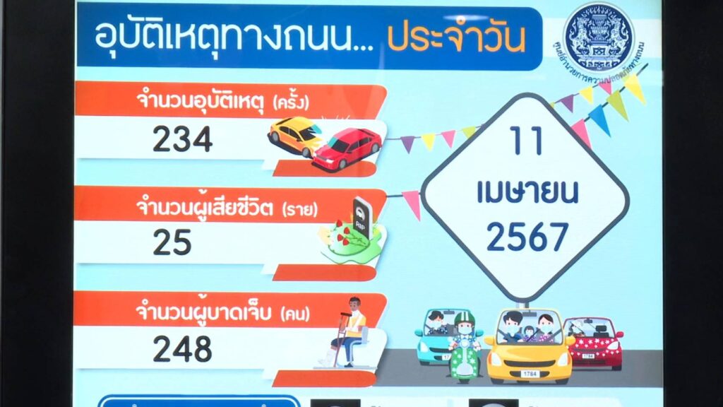 ด้านนายไชยวัฒน์ จุนถิระพงศ์ อธิบดีกรมป้องกันและบรรเทาสาธารณภัย (ปภ.) ในฐานะเลขานุการศูนย์อำนวยการความปลอดภัยทางถนน เปิดเผยว่า ศูนย์อำนวยการป้องกันและลดอุบัติเหตุทางถนนช่วงเทศกาลสงกรานต์ พ.ศ. 2567 โดยกรมป้องกันและบรรเทาสาธารณภัย และความร่วมมือของหน่วยงานภาคีเครือข่าย ได้รวบรวมสถิติอุบัติเหตุทางถนนประจำวันที่ 11 เมษายน 2567 ซึ่งเป็นวันแรกของการรณรงค์ “ขับขี่อย่างปลอดภัย เมืองไทยไร้อุบัติเหตุ” เกิดอุบัติเหตุ 234 ครั้ง ผู้บาดเจ็บ 248 คน ผู้เสียชีวิต 25 ราย