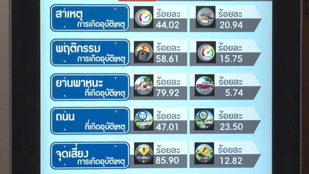 ช่วงเวลาที่เกิดอุบัติเหตุสูงสุด ได้แก่ เวลา 16.01-17.00 น. ร้อยละ 8.55 ผู้บาดเจ็บและเสียชีวิตสูงสุดอยู่ในช่วงอายุ 20-29 ปี ร้อยละ 16.48 จัดตั้งจุดตรวจหลัก 1,729 จุด เจ้าหน้าที่ปฏิบัติงาน 51,203 คน โดยจังหวัดที่เกิดอุบัติเหตุสูงสุด ได้แก่ สงขลา (11 ครั้ง) จังหวัดที่มีผู้บาดเจ็บสูงสุด ได้แก่ สงขลา (13 คน) จังหวัดที่มีผู้เสียชีวิตสูงสุด ได้แก่ กรุงเทพมหานคร (3 ราย)