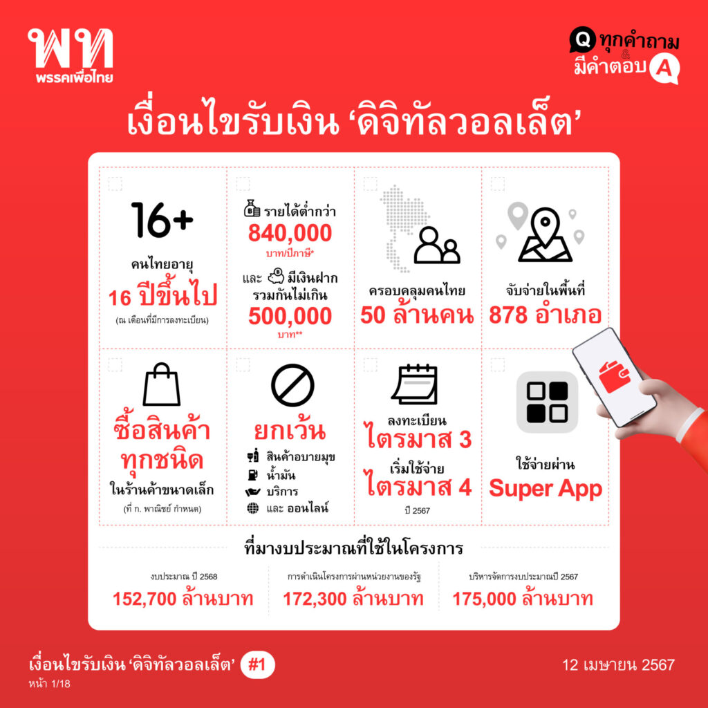 กรุงเทพฯ 12 เม.ย. – พรรคเพื่อไทยโพสต์ทุกคำถามมีคำตอบเงื่อนไขรับดิจิทัลวอลเล็ต” 17 ข้อ แก้ปมสงสัย-สับสน