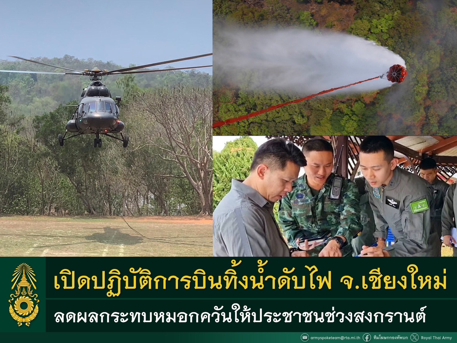 ตามสั่งการของ พลเอก เจริญชัย หินเธาว์ ผู้บัญชาการทหารบก ในฐานะผู้อำนวยการศูนย์บรรเทาสาธารณภัยกองทัพบก และคณะกรรมการจัดการปัญหามลพิษทางอากาศเพื่อความยั่งยืนของรัฐบาล ให้นำเฮลิคอปเตอร์ทั่วไป MI-17 เข้าสนับสนุนภารกิจดับไฟป่าภาคเหนือเพิ่มเติมตั้งแต่วันที่ 9 เม.ย.67 ร่วมกับส่วนราชการที่เกี่ยวข้อง เพื่อแก้ไขปัญหาไฟป่า หมอกควัน และฝุ่นละออง PM2.5 ในช่วงสถานการณ์วิกฤติ