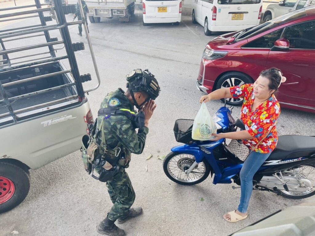 โดยทหารจากหน่วยเฉพาะกิจราชมนู (ฉก.ราชมนู ) กองกำลังนเรศวร นำกำลังทหารสับเปลี่ยนเวรยามยืนดูแลรักษาความปลอดภัยบริเวณสะพานมิตรภาพไทย-เมียนมา แห่งที่ 1 และ 2 ทำให้พี่น้องประชาชนใน อ.แม่สอด จ.ตาก และนักท่องเที่ยวที่เดินทางมาเที่ยวบริเวณสะพานมิตรภาพ เห็นถึงการปฏิบัติหน้าที่ของเจ้าหน้าที่ทหาร ประกอบกับสภาพอากาศที่ร้อน ต่างพากันนำน้ำดื่ม ขนม และข้าวกล่อง มามอบให้ทหาร ตำรวจ ฝ่ายปกครอง โดยไม่ได้นัดหมาย เพื่อเป็นขวัญและกำลังใจที่เสียสละปกป้องอธิปไตยเพื่อชาติไทยและพี่น้องประชาชนคนไทย ซึ่งต่างมีหน้าตาที่ยิ้มแย้มทั้งผู้มอบและผู้รับ ทำให้อากาศที่ว่าร้อนกลับเย็นลงทันที.-313-สำนักข่าวไทย