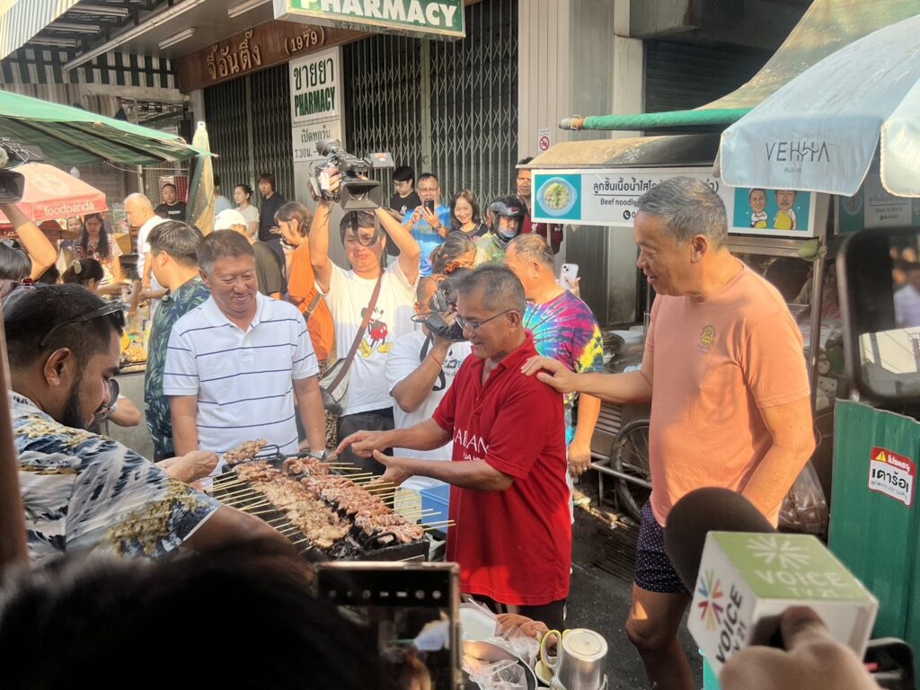โดยทันทีที่ นายกรัฐมนตรี เดินทางมาถึงได้ใส่บาตรพระสงฆ์จำนวน 9 รูป ซึ่งในวันนี้ตรงกับวันครอบครัว 14 เมษายน ก่อนที่จะมาพูดคุยกับพ่อค้าร้านหมูปิ้ง โดยสอบถามว่าขายดีหรือไม่ ซึ่งพ่อค้าระบุว่า ขายดีมากครับ นายกรัฐมนตรี จึงถามต่อถึงเรื่องค่าครองชีพ ซึ่งพ่อค้ารายดังกล่าวก็กล่าวต่อว่า ดีขึ้นแล้วครับ ที่ท่านมาเป็นนายกฯ ธุรกิจผมดีมากเลยครับ ซึ่งสร้างเสียงหัวเราะให้กับนายกฯและคณะ พ่อค้าขายหมูปิ้ง จึงพูดย้ำว่า ขายดีอยู่แล้ว และยิ่งขายดีมากขึ้น ไม่ได้โม้นะ