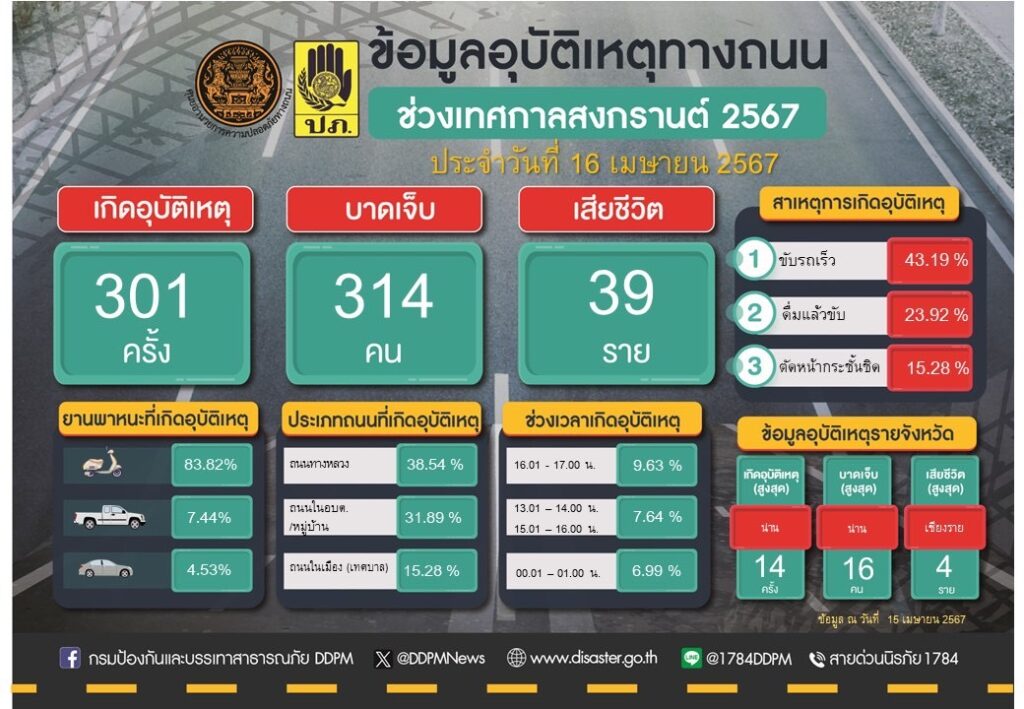 นายแพทย์ชลน่าน ศรีแก้ว รัฐมนตรีว่าการกระทรวงสาธารณสุข ในฐานะประธานแถลงผลการดำเนินงานของศูนย์อำนวยการป้องกันและลดอุบัติเหตุทางถนนช่วงเทศกาลสงกรานต์ พ.ศ. 2567 เปิดเผยว่า ศูนย์อำนวยการป้องกันและลดอุบัติเหตุทางถนนช่วงเทศกาลสงกรานต์ พ.ศ. 2567 โดยกรมป้องกันและบรรเทาสาธารณภัยและความร่วมมือของหน่วยงานภาคีเครือข่ายได้รวบรวมสถิติอุบัติเหตุทางถนนประจำวันที่ 15 เมษายน 2567 ซึ่งเป็นวันที่ห้าของการรณรงค์ “ขับขี่อย่างปลอดภัย เมืองไทยไร้อุบัติเหตุ” เกิดอุบัติเหตุ 301 ครั้ง ผู้บาดเจ็บ 314 คน ผู้เสียชีวิต 39 ราย สาเหตุที่ทำให้เกิดอุบัติเหตุสูงสุด ได้แก่ ขับรถเร็ว ร้อยละ 43.19 ดื่มแล้วขับ ร้อยละ 23.92 ตัดหน้ากระชั้นชิด ร้อยละ 15.28 ยานพาหนะที่เกิดอุบัติเหตุสูงสุด ได้แก่ รถจักรยานยนต์ ร้อยละ 83.82 ส่วนใหญ่เกิดบนเส้นทางตรง ร้อยละ 78.74 ถนนกรมทางหลวง ร้อยละ 38.54 ถนนใน อบต./หมู่บ้าน ร้อยละ 31.89 ช่วงเวลาที่เกิดอุบัติเหตุสูงสุด ได้แก่ เวลา 16.01 – 17.00 น. ร้อยละ 9.63 ผู้บาดเจ็บและเสียชีวิตสูงสุดอยู่ในช่วงอายุ 20-29 ปี ร้อยละ 18.13 จัดตั้งจุดตรวจหลัก 1,756 จุด เจ้าหน้าที่ปฏิบัติงาน 51,386 คน โดยจังหวัดที่เกิดอุบัติเหตุสูงสุด ได้แก่ น่าน (14 ครั้ง) จังหวัดที่มีผู้บาดเจ็บสูงสุด ได้แก่ น่าน (16 คน) จังหวัดที่มีผู้เสียชีวิตสูงสุด ได้แก่ เชียงราย (4 ราย) สรุปอุบัติเหตุทางถนนสะสมในช่วง 5 วันของการรณรงค์ (11 – 15 เม.ย. 67) เกิดอุบัติเหตุรวม 1,564 ครั้ง ผู้บาดเจ็บรวม 1,593 คน ผู้เสียชีวิต รวม 206 ราย จังหวัดที่ไม่มีผู้เสียชีวิต (ตายเป็นศูนย์) มี 17 จังหวัด จังหวัดที่เกิดอุบัติเหตุสะสมสูงสุด ได้แก่ เชียงราย (61 ครั้ง) จังหวัดที่มีผู้บาดเจ็บสะสมสูงสุด ได้แก่ น่าน (60 คน) จังหวัดที่มีผู้เสียชีวิตสะสมสูงสุด ได้แก่ กรุงเทพมหานครและเชียงราย (13 ราย)